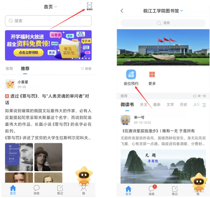 第一步:下载安装客户端,在各大应用市场或App Store中搜索并下载【学习通】客户端,或直接扫描下方二维码进行下载安装 第二步:打开【学习通】,点击【新用户注册】,填写手机号并获取验证码,设置符合要求的密码后,点击【下一步】 第三步:进入填写昵称页面,输入后即可进入app 第四步:首页右上角输入邀请码:wjgxytsg第五步:选择座位预约,进入选座页面,右上角有规则说明可根据需要了解