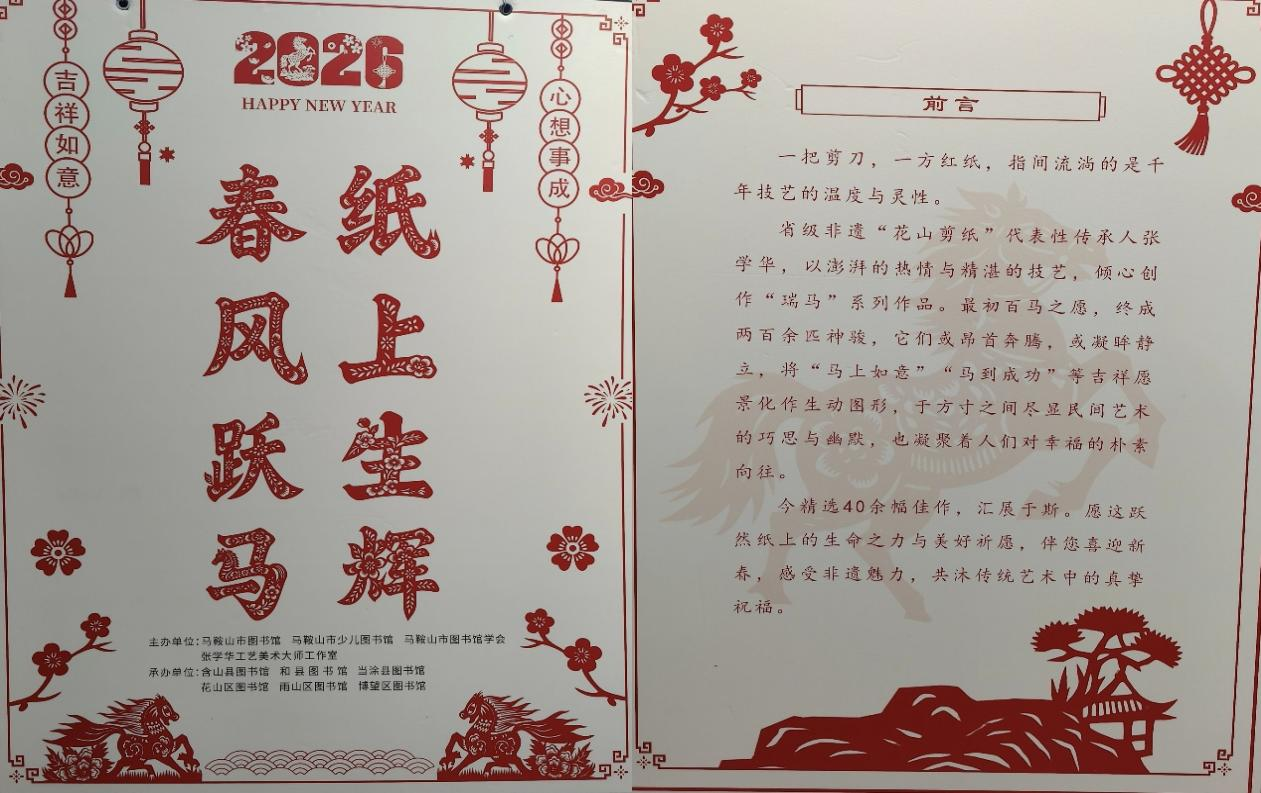 为传承中华优秀传统文化,感受非遗剪纸艺术魅力,在2026马年新春之际,beat365正版唯一官方网站图书馆联合马鞍山市图书馆、马鞍山市少儿图书馆、马鞍山市图书馆学会及张学华工艺美术大师工作室,共同举办“春风跃马 纸上生辉”张学华“瑞马”系列剪纸艺术展,为全校师生献上一场饱含吉祥寓意的视觉盛宴。