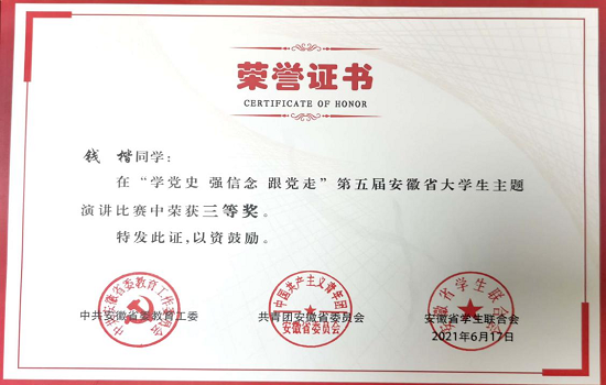20级健康服务与管理专业学生钱楷的《奉献我青春,扬帆新时代》荣获市二等奖,18级能源与动力工程专业学生汪始兴《青春铸就时代,韶光不负国家》荣获市优秀奖。同时,月初在合肥举办的安徽省“学党史、强信念、跟党走”大学生主题演讲比赛中,钱楷同学荣获省三等奖。