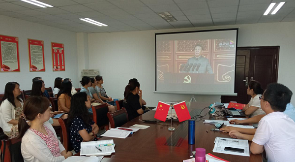 学校领导班子成员、各党总支书记、副书记等人员,在行政楼会议室集中收看了大会直播。全体人员佩戴党员徽章、端坐台下,聚精会神地观看,并不时记录习近平总书记重要讲话内容。