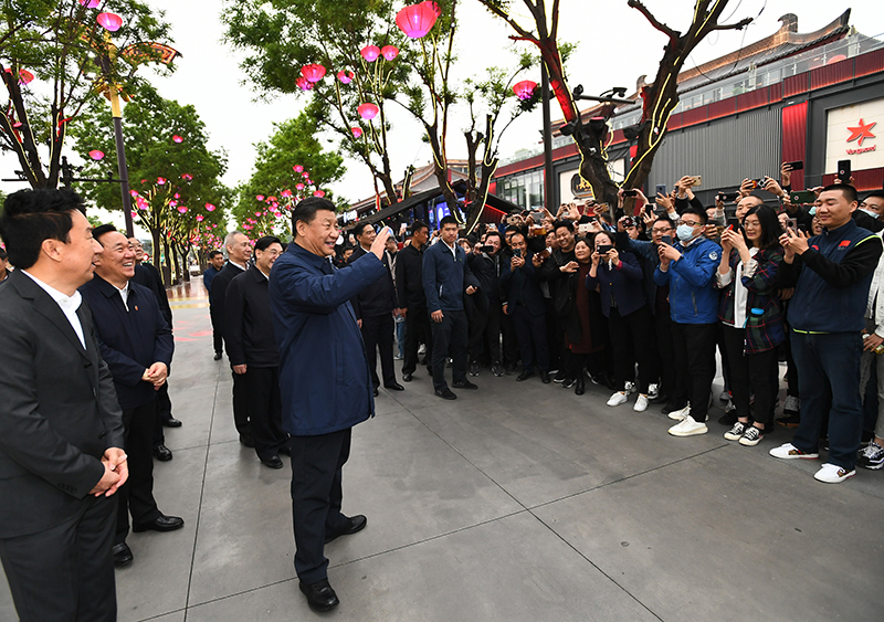 4月20日至23日,中共中央总书记、国家主席、中央军委主席习近平在陕西考察。这是4月22日,习近平在西安大唐不夜城步行街考察时,向游客挥手致意。