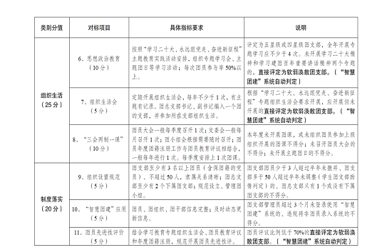 ——软弱涣散团支部(60分以下,或存在“一票否决”指标所列情况的)。