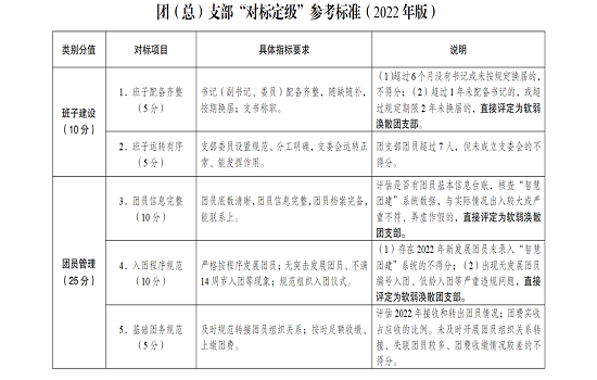 2022年度“对标定级”工作于12月集中开展,12月10日前完成。针对成立6个月以上(2022年6月1日前成立)的团支部。(流动团员团支部、临时团支部、待转接团支部等不纳入“对标定级”范围。)