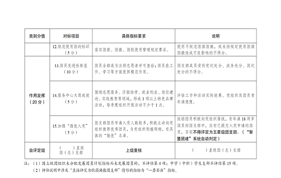 对照“对标定级”参考标准(2022年版)(附件一),重点评估2022年度团支部标准化、规范化建设和组织功能发挥情况。实行百分制赋分评定,各项指标分别赋分。对应星级参考如下: