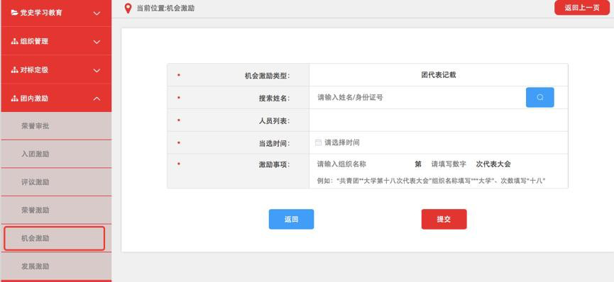 (1)团组织管理员点击“团内激励-机会激励”菜单,选择“团代表记载”进入默认界面。