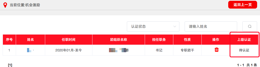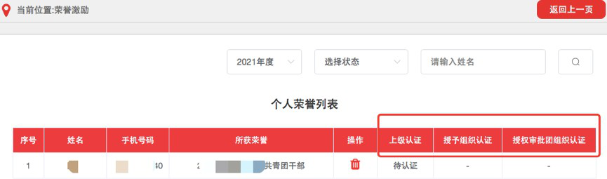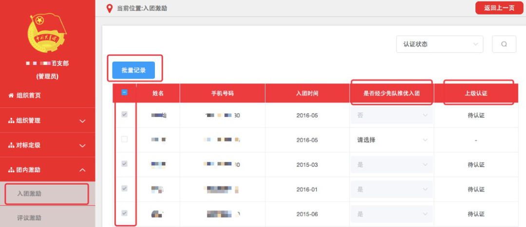 (3)记载完成后,须由直属上级团组织审核,审核通过后生效。团支部管理员可在“上级认证”列查看审核进度。