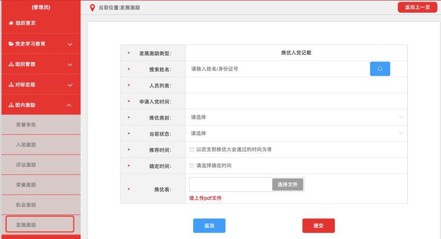 (1)团组织管理员点击“团内激励-发展激励”菜单,选择“推优入党记载”进入默认界面。