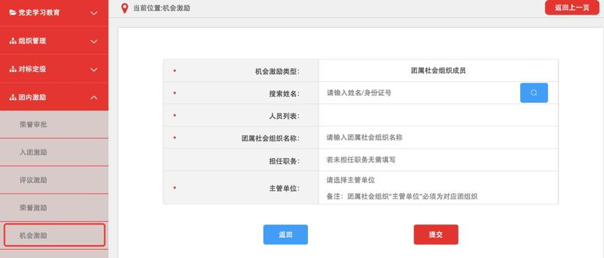 记载担任团内职务,作为团代表(团的委员会成员)人选,团属社会组织成员,以及推荐参加团的重大活动、特色实践活动、党和政府重大活动等信息。各级团组织均具有机会激励记载权限,具体操作步骤如下。