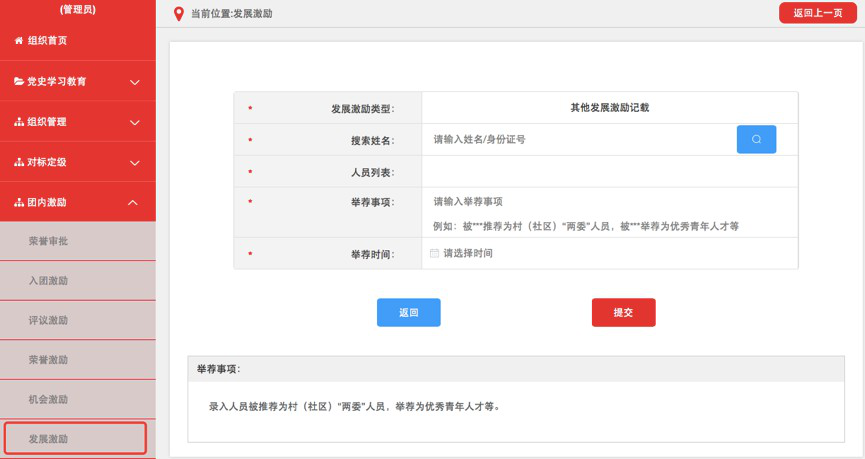 (1)团组织管理员点击“团内激励-发展激励”菜单,选择“其他发展激励记载”进入默认界面。