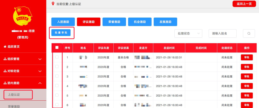 上级认证功能用于审批下级团组织提交的入团激励、评议激励、荣誉激励、机会激励、发展激励业务。具体操作步骤如下。