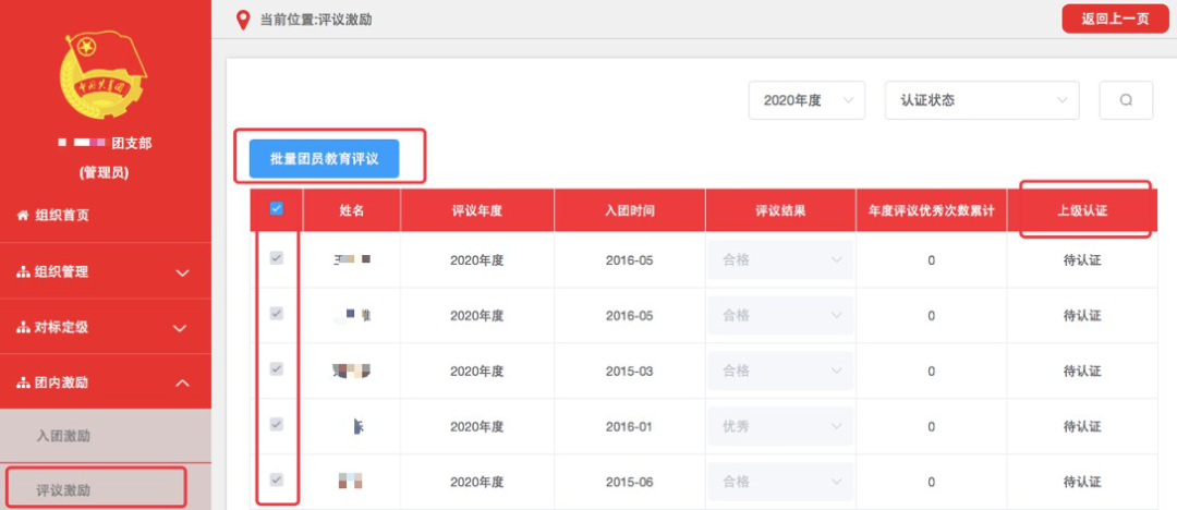 (3)评议结果记载完成后,须由直属上级团组织审核,上级团组织可结合实际调整评议等次。根据审核规则,评议结果为基本合格/不合格的团员,上级团组织在审核前须审阅组织处置或纪律处分决定。团支部管理员可在“上级认证”列中查看审核进度。