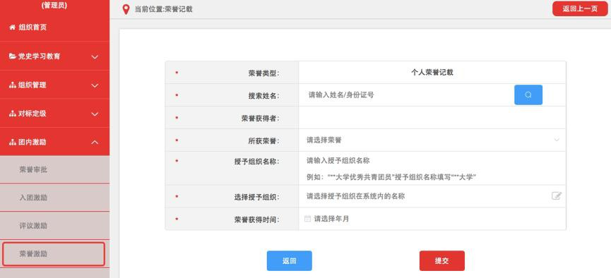 记载各级优秀共青团员、优秀共青团干部(含少先队辅导员)、五四红旗团组织、青年五四奖章等团内个人和集体政治类荣誉。各级团组织均具有荣誉激励记载权限。具体操作步骤如下。