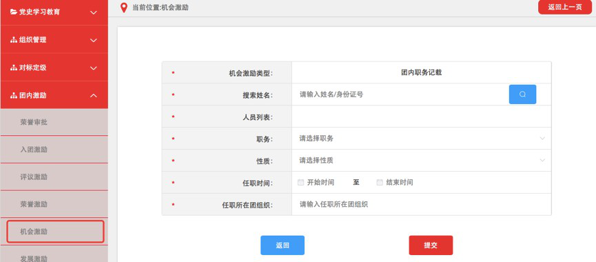 (1)团组织管理员点击“团内激励-机会激励”菜单,选择“团内职务记载”进入默认界面。
