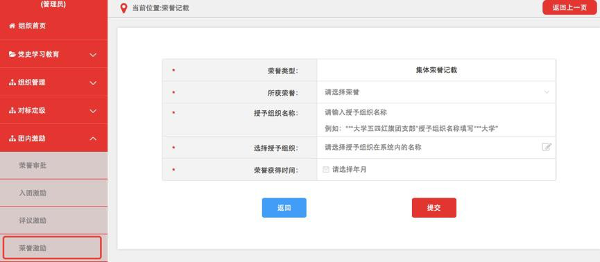(1)团组织管理员点击“团内激励-荣誉激励”菜单,选择“集体荣誉记载”进入默认界面。
