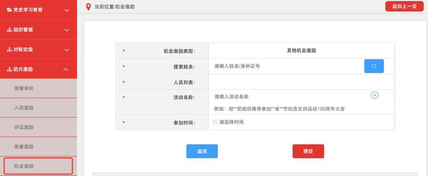 (1)团组织管理员点击“团内激励-机会激励”菜单,选择“其他机会激励记载”进入默认界面。