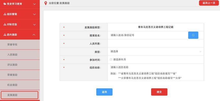 (1)团组织管理员点击“团内激励-发展激励”菜单,选择“青马工程记载”进入默认界面。