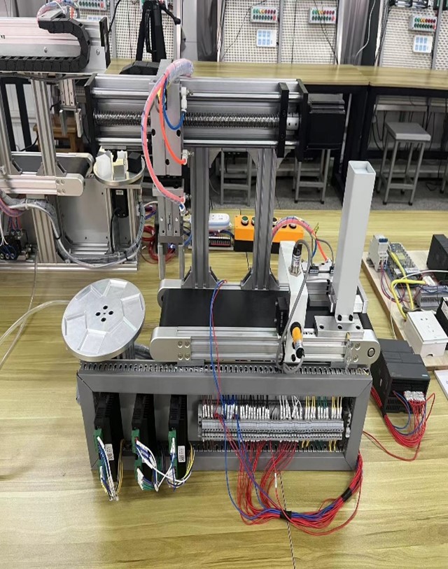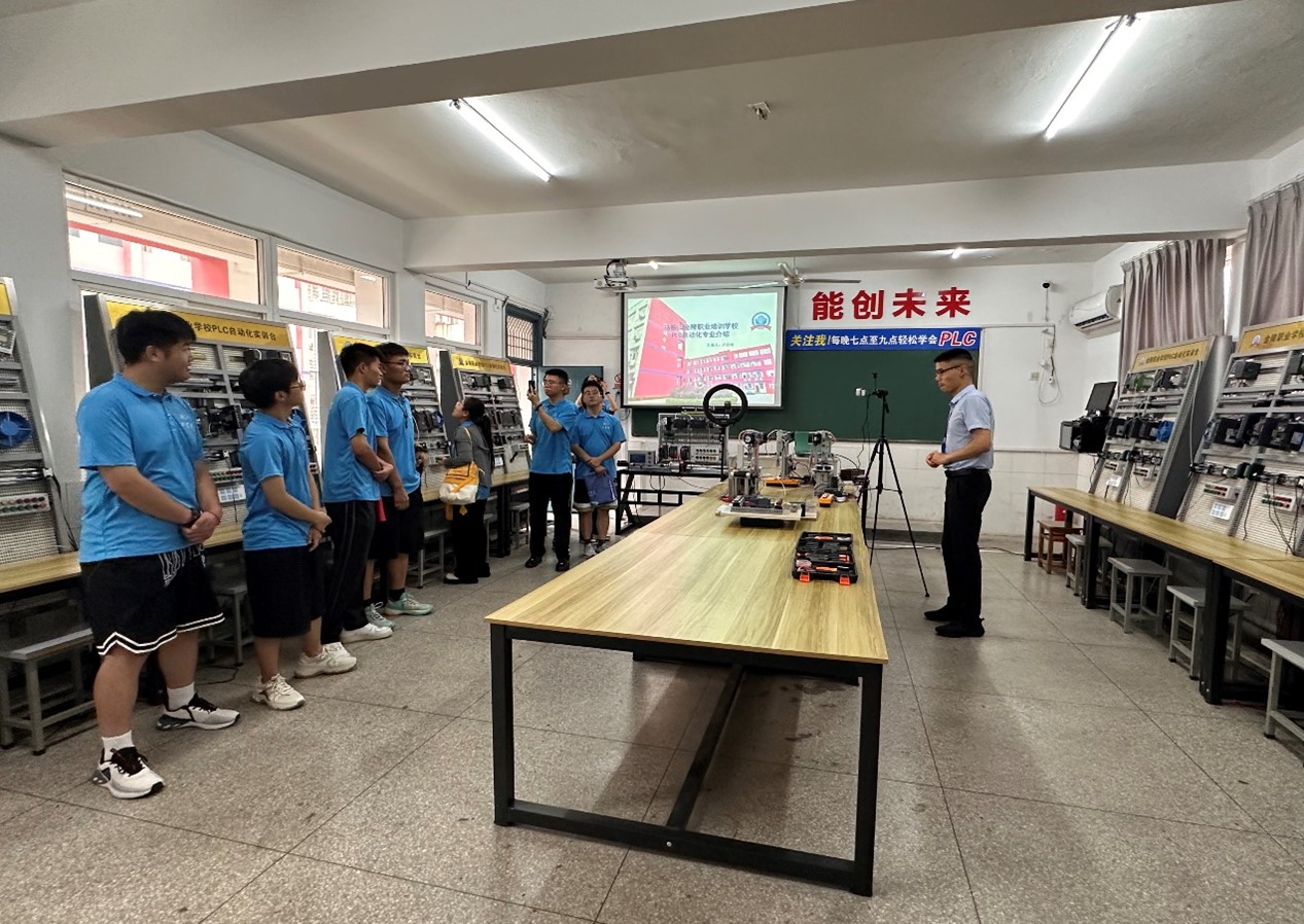 马鞍山明跃自动化科技有限公司的卢昌明老师详细介绍了这些设备的功能和操作方法,展示了如何通过编程实现对生产流程的精确控制。学员们在这里进行实际操作,将理论知识转化为实际技能。参观团队成员们饶有兴致地观察着学员们的实践操作,不时与老师和学员交流,了解他们在学习过程中的心得和遇到的问题。