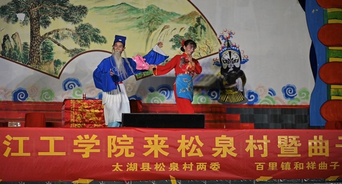 实践团与太湖县百里镇党支部、省级非物质文化遗产和祥曲子戏演艺有限公司负责人田诗英一同前往百里镇松泉村党支部乡村大舞台,为村民表演曲子戏优秀剧目。