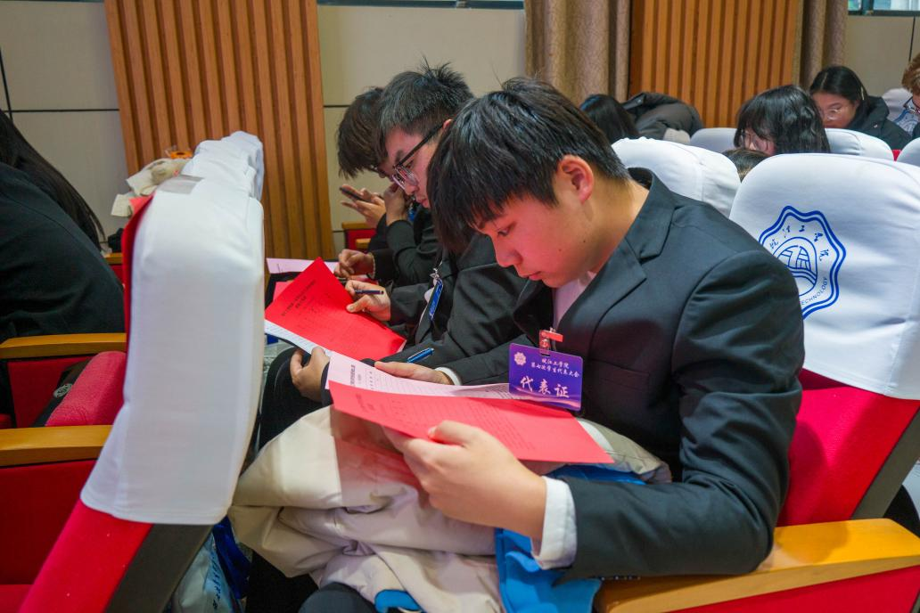 第一次全体会议上,乔曼同学代表第六届学生委员会作了题为《擎时代火炬 展青春担当 为全面建成特色鲜明的地方性应用型高水平大学而努力奋斗》的工作报告。会议审议并通过了大会选举办法、总监票人及监票人名单等,宣布了第七届学生委员会委员候选人预备人选及新一届学生会主席团候选人预备人选名单,听取了主席团候选人的竞选宣讲。