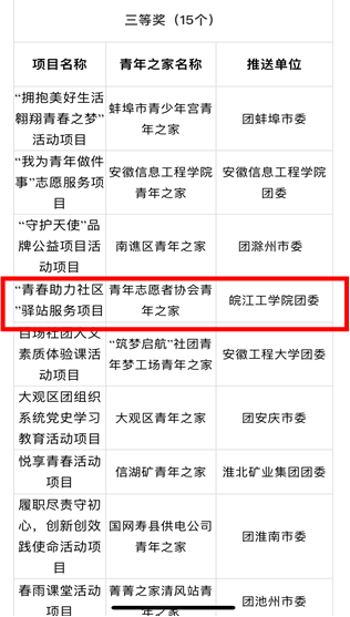10月22日,第四届全省“青年之家”优秀活动项目评选活动在合肥举行,经初赛推荐、专家初评和网上展评等环节,最终30个项目入围决赛,其中高校入围仅6项,beat365推报的“青春助力社区驿站服务”项目成功入围,校团委指导教师龚彭甦参加现场答辩,并荣获安徽省三等奖及“优秀组织奖”荣誉称号。