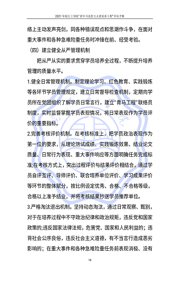 C4.深化“青马工程”,引导青年政治骨干坚定理想信念,深入基层学习锻炼,学员中学生团干部占比60%以上。 | 4 | 是/否 | 是 | ①校级“青马工程”学员404人,其中学生团干部351人; ②校级“青马工程”学员(√是/£否)面向全校公示; ③校学生会主席团成员(√是/£否)为校“青马工程”当然人选; ④“青马工程”(√是/£否)覆盖到院系; ⑤院系“青马工程”学员640人,其中学生团干部450人; ⑥院学生会主席团成员(√是/£否)为院“青马工程”当然人选; ⑦全校学生团干部共1743人; ⑧违规违纪学员(√是/£否)有退出机制。 |