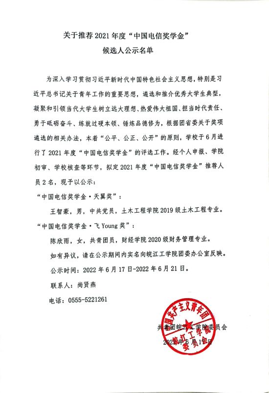 关于推荐2021年度 “中国电信奖学金”候选人公示名单