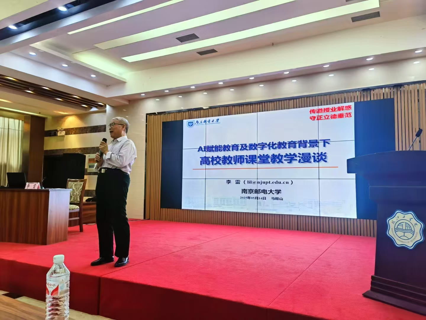 5月14日下午,南京邮电大学李雷教授在文海宾馆多功能厅以“AI赋能教育及数字化教育转型背景下高校教师课堂教学漫谈”为题,为通识教育学院、马克思主义学院、创新与产业工程师学院教师擘画教育数字化蓝图。李教授指出,面对人工智能技术革新,高校教师需主动拥抱变革,将数字化工具融入教学实践,同时坚守“立德树人”初心,明道信道、以德施教,争做学生成长的引路人与先进思想文化的传播者。
