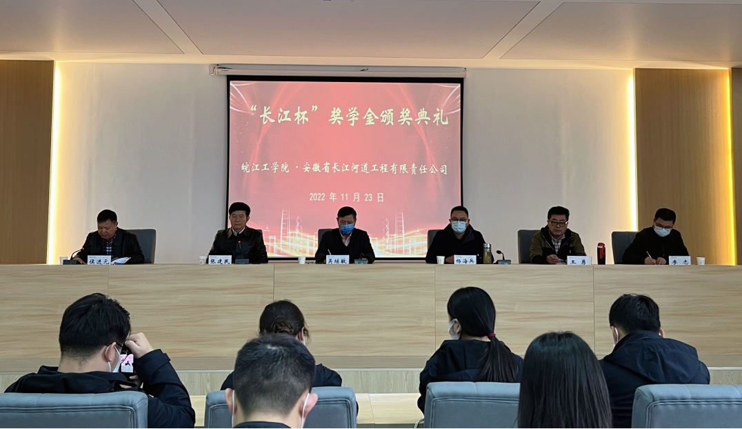 11月23日下午,2021-2022学年beat365正版唯一官方网站“长江杯奖学金”颁奖典礼在新水利土木楼301会议室隆重举行,校长吴继敏,副校长张建民、侯进元和安徽省长江河道工程有限责任公司董事长杨海兵、技术顾问王勇、常务副总经理李志在主席台就坐。学生工作部、水利工程学院、土木工程学院相关负责人及部分学生代表出席。仪式由张建民主持。