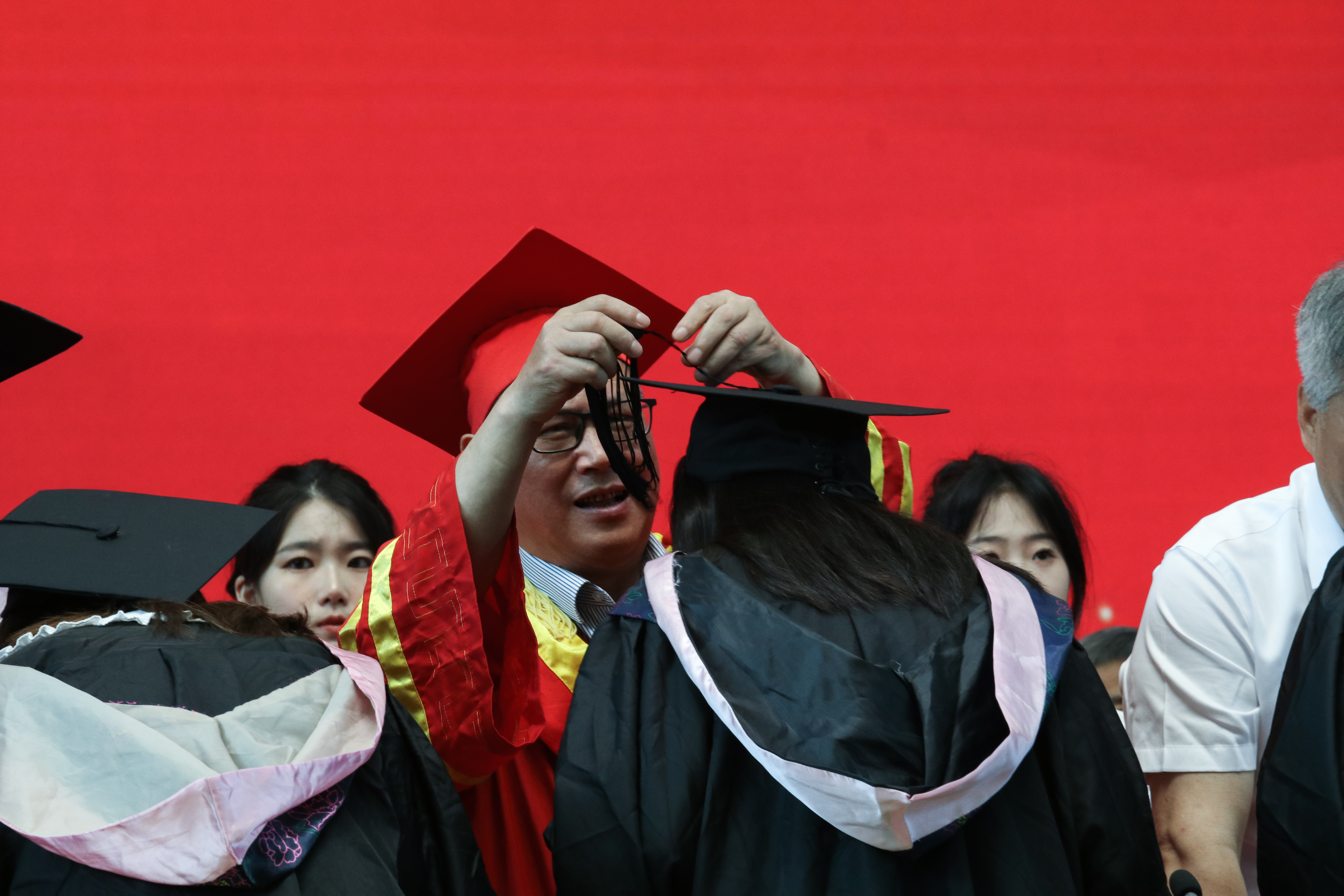 随后,在学士学位授予仪式上,各二级学院毕业生代表依次上台,校领导们为他们拨穗正冠、授予学位证书,并合影留念。