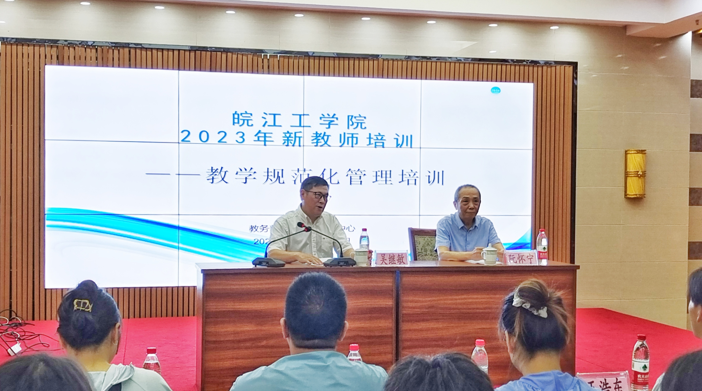 本次培训共有五场主题报告:第一场由教务部部长江冰作题为《教师课程教学规范(课程类)》报告;第二场由教务部副部长葛文生和实践科科长杨扬作题为《教师课程教学规范(实践类)》报告;第三场由教务部常务副部长孙娴和水利水电工程学院教学科研班主任黄彦作题为《教学档案材料归档管理规范》报告;第四场由双创学院院长朱昌平、院长助理陶彬彬和骨干教师周宇赫作题为《新教师如何参与创新创业指导工作》报告;第五场由评估办常务副主任黄翠作题为《新教师如何参与创新创业指导工作》报告。