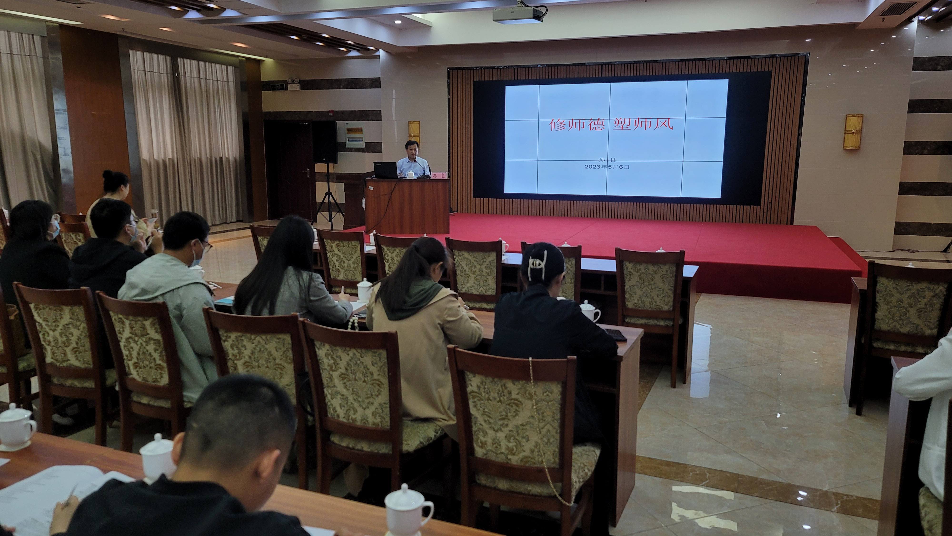 为积极引导广大教师坚定理想信念、厚植爱国情怀、涵养高尚师德,8月30日下午,教师发展中心率先在文海宾馆四楼多功能会议室召开庆祝2023年教师节暨师德师风建设专题会议。党委副书记孙良做主题发言,深入浅出的指出,“三个牢固树立”、“四有”好老师、“四个引路人”、“四个相统一”、“六要”等理论内涵,鼓励新教师在做好教学工作的过程中,坚持学习,把“师德”与“师风”,“校风”与“学风”落实到日常教育教学各个环节,并对全院教职工表达了节日的祝福,希望各位老师在学院及学校提供的良好平台上再接再厉、锐意进取、勇攀高峰,继续推动学院新发展。随后,教师发展中心魏莹莹结合先进教师模范和失范典型事例,对教育部和省教育厅师德师风相关文件进行解读。