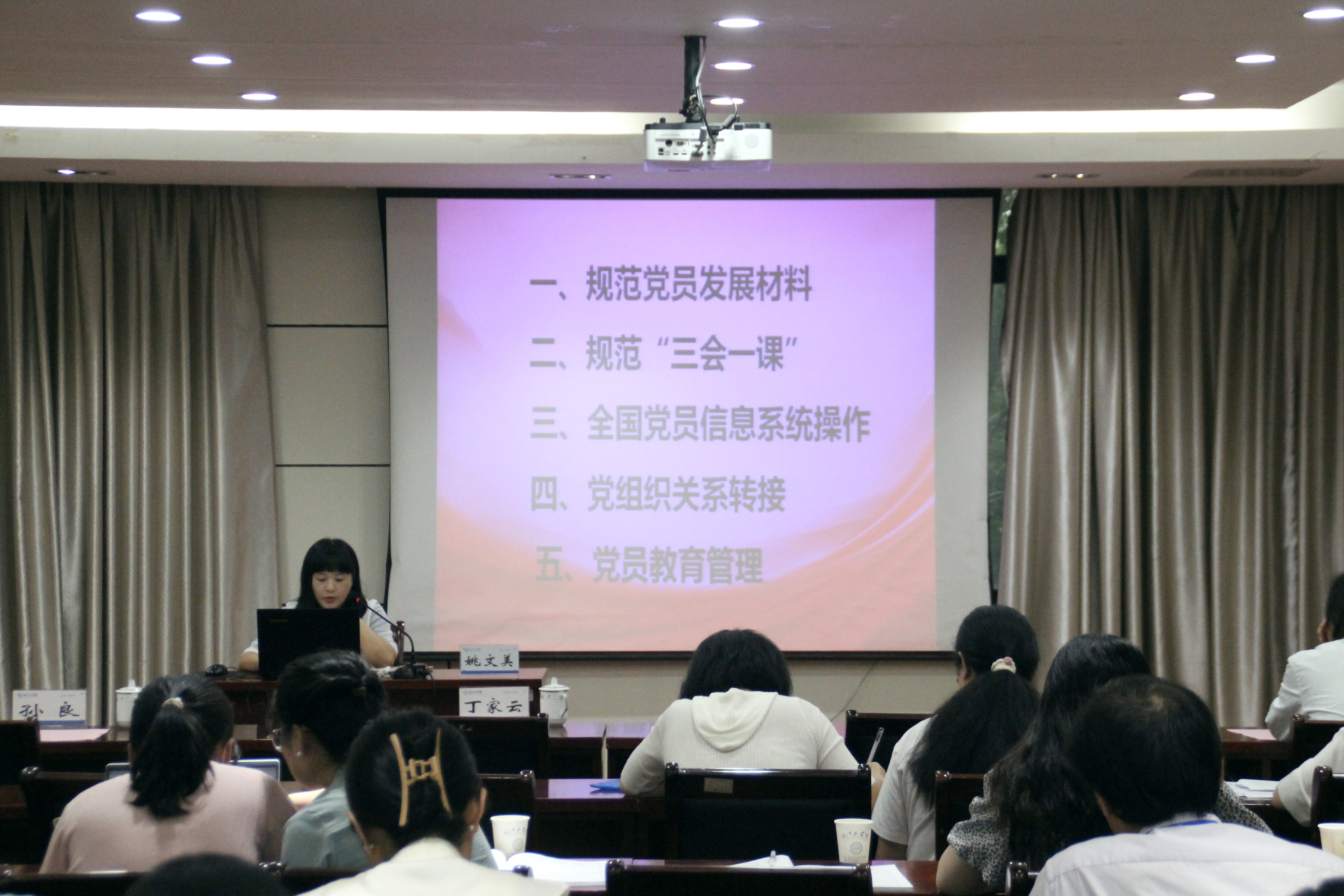 为规范发展党员工作程序,加强学校党员队伍建设,姚文美分别从规范党员发展材料、如何规范“三会一课”、如何操作全国党员信息系统、党组织关系转接相关事项以及党员教育管理五个方面具体阐释了学校发展党员流程,同时号召各基层党支部书记、组织员高质量做好党员教育管理工作和学生党员发展工作。