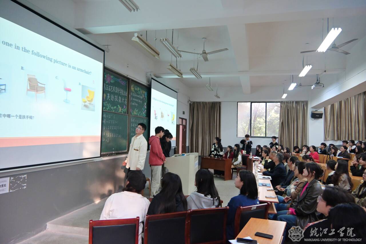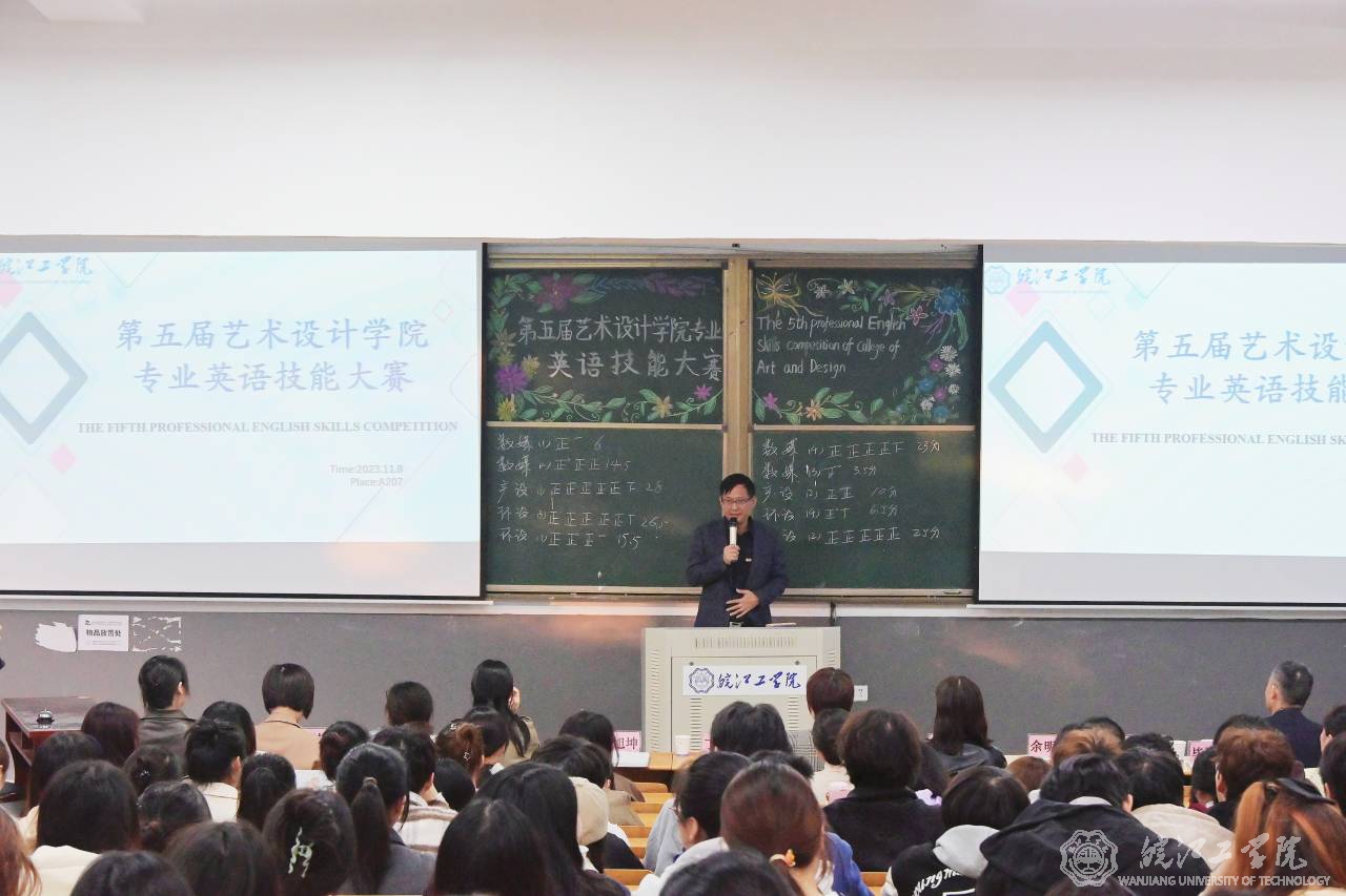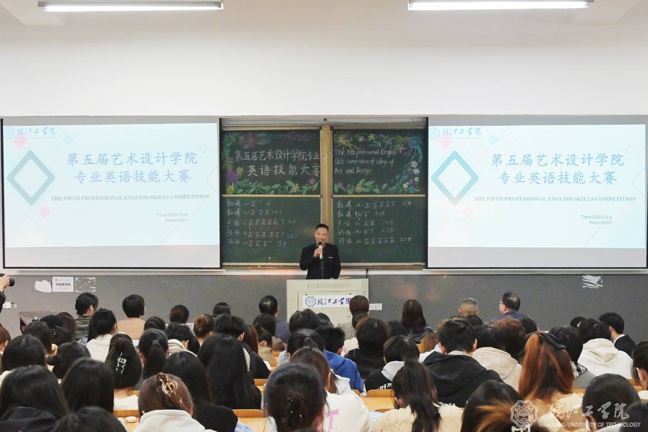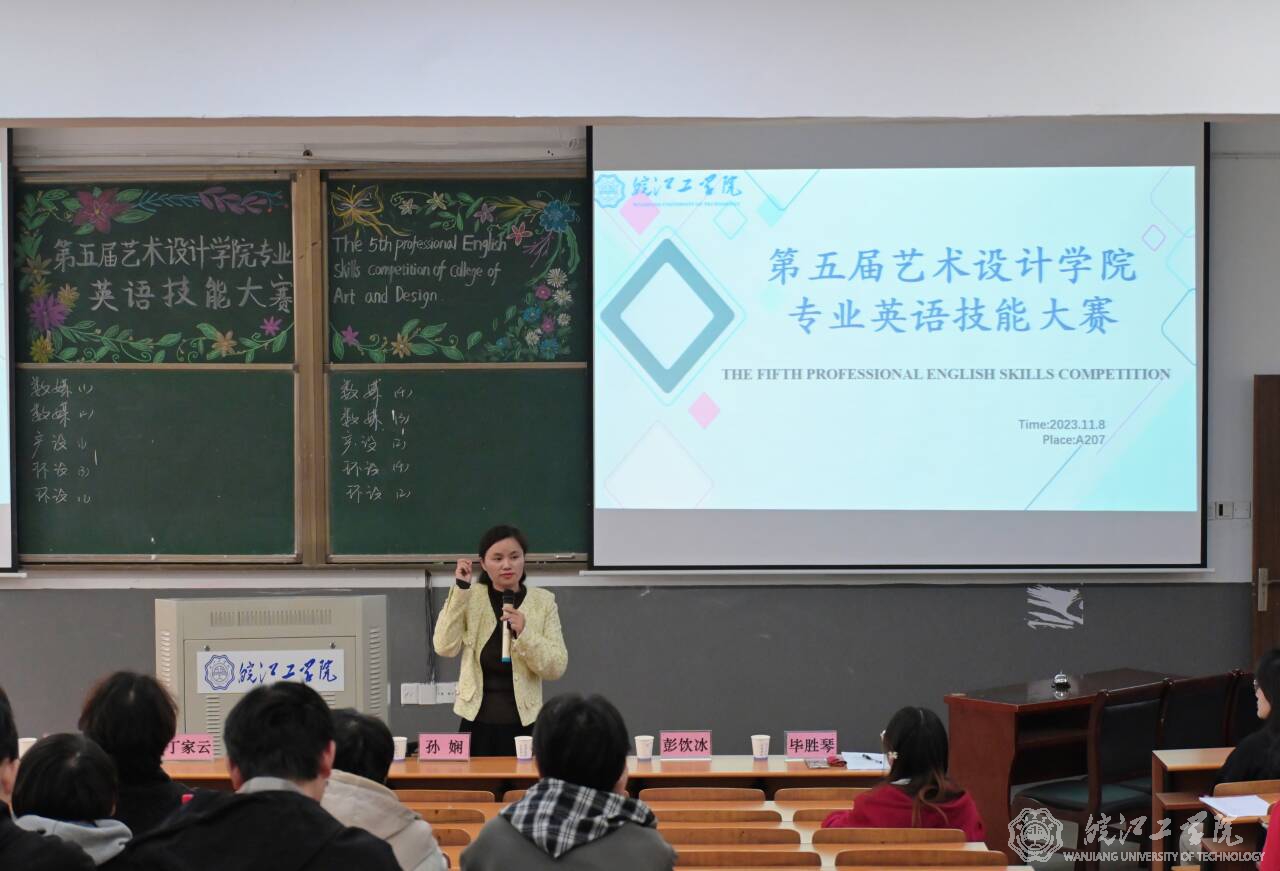 11月8日下午,校第五届艺术设计学院专业英语技能大赛在A207成功举行。本次大赛由基础部外语教研室毕胜琴老师组织策划,艺术设计学院学生全体参与。校党委书记丁家云,艺术设计学院党总支书记张亚梅、院长伍旭坤,基础部主任余明江,教务部常务副部长孙娴,评估办常务副主任黄翠,艺术设计学院副院长金花,党总支副书记程楠楠,分团委书记刘慧等领导出席观摩,比赛在毕胜琴老师的致辞中拉开帷幕。