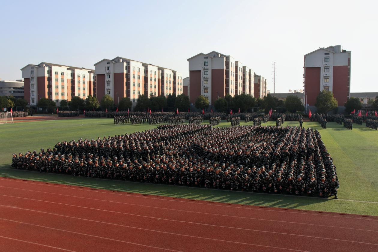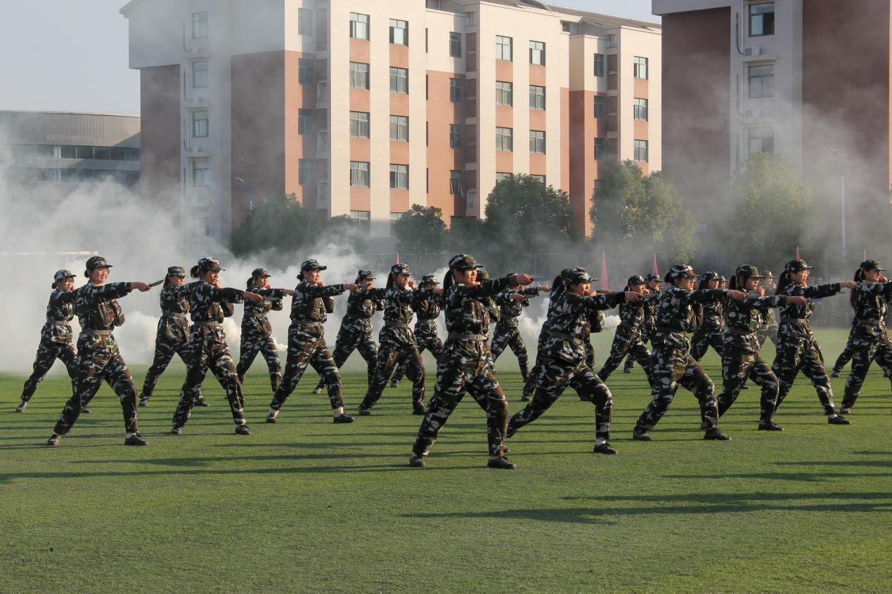 缓缓升起的国旗伴着响亮威严的国歌,新生军训成果汇报暨表彰大会正式拉开帷幕。首先进行的是女子方队摆字表演,在声如洪钟的叫喊声中同学们将“10、9、8、……”“不忘初心,牢记使命”等祝福字样不断展现出来,并齐声高喊“上善若水,笃学敦行”的校训。伴随着弥漫的烟雾,即将向我们呈现的是两套军体拳表演。他们手握匕首,壮志凌云,一套套军体拳行如流水,让在场的所有人无不为之震撼。