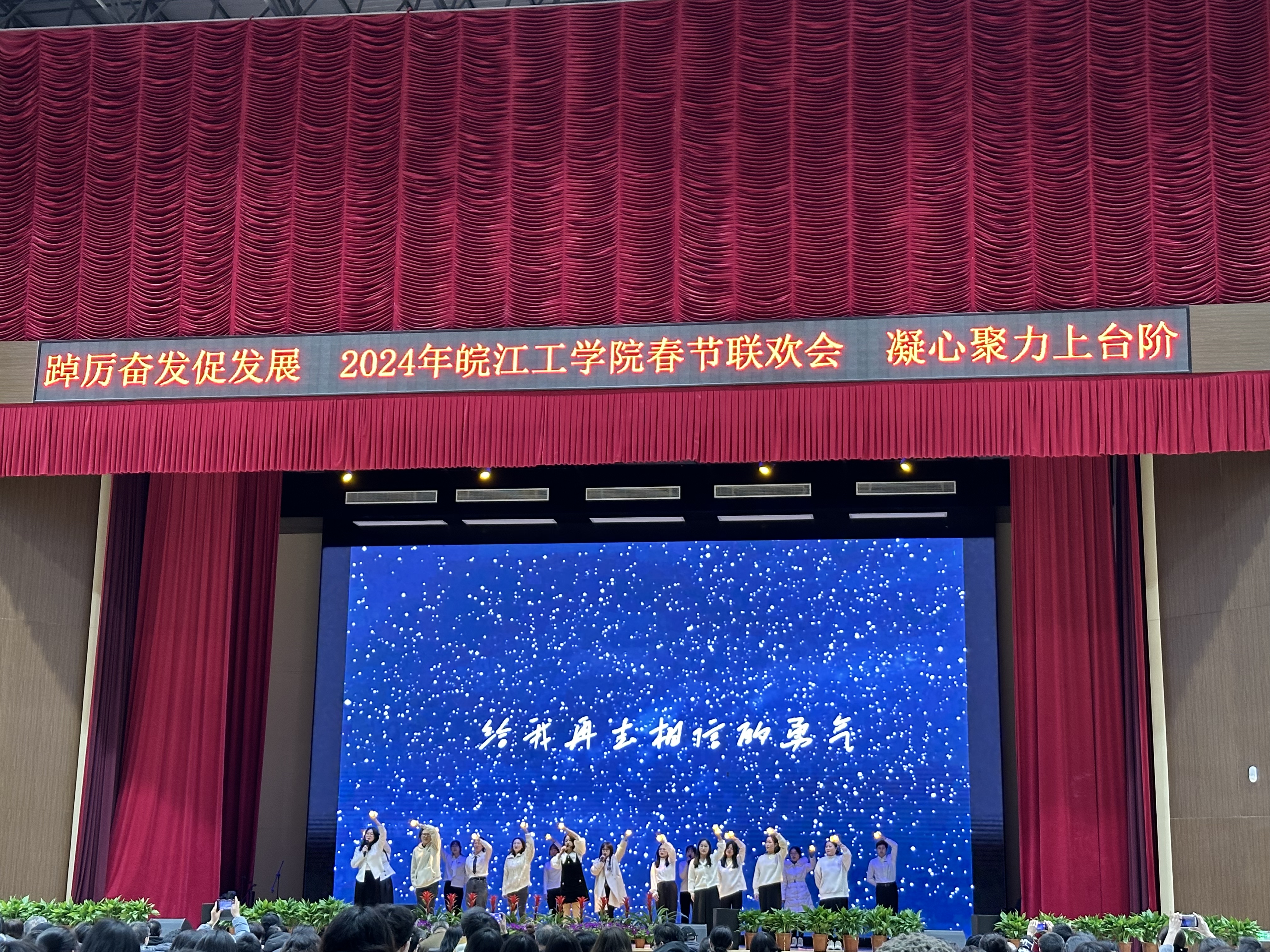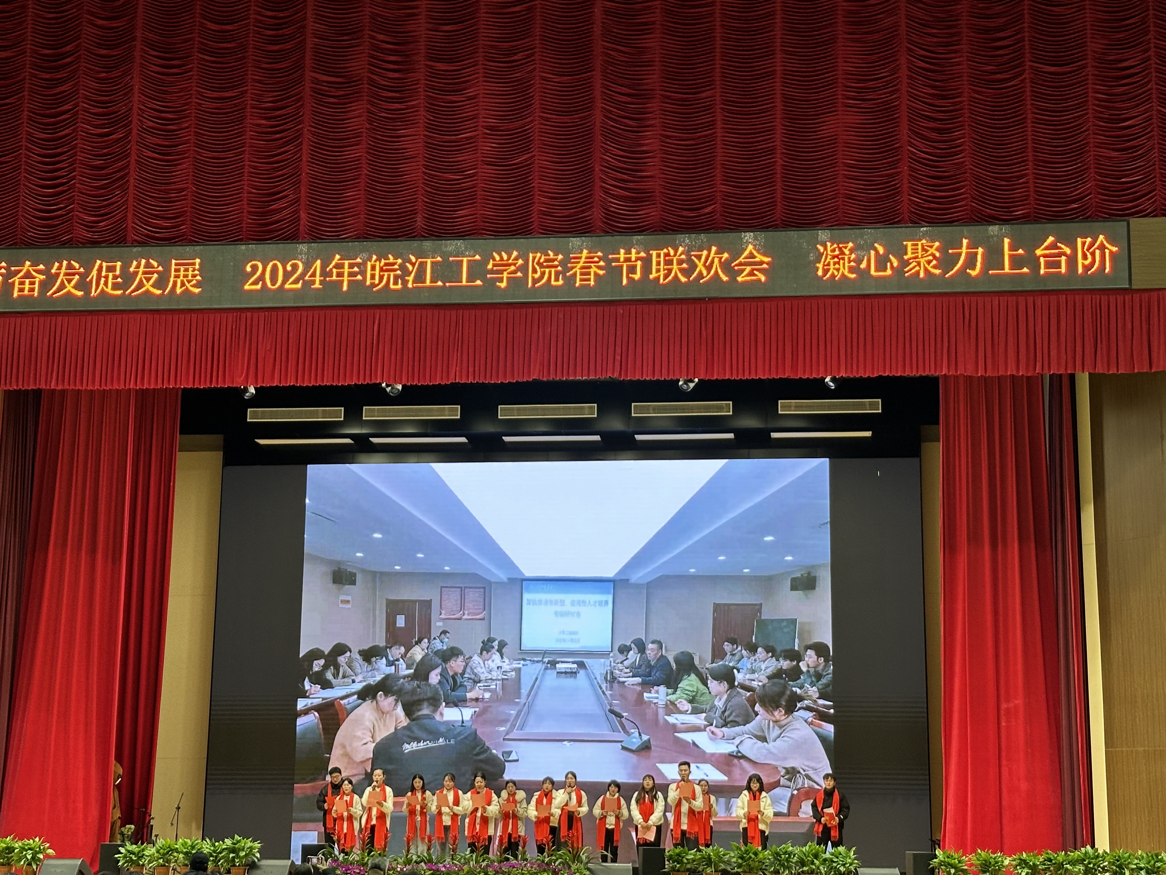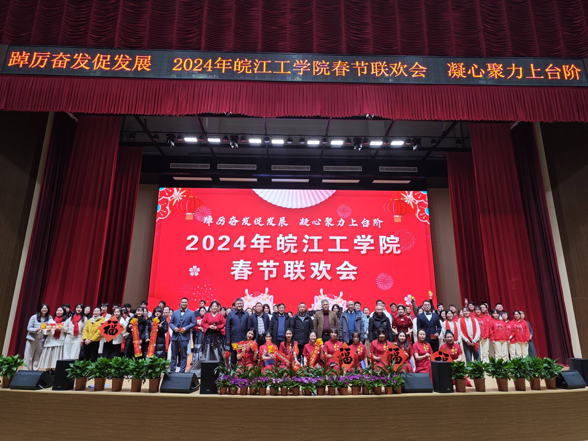 在一阵阵鼓掌声中迎来了2024年beat365正版唯一官方网站春节联欢会。学校职能部门以及水利工程学院、土木工程学院、电气信息工程学院、机械工程学院、财经学院等二级学院相继上台进行表演。演出形式丰富多彩,从合唱、歌舞到相声、配乐诗朗诵等,每个节目都充分展示了学校教职工良好的精神面貌和深刻的情感表达,为在场的所有人带来了一场视觉和听觉的盛宴,最后郑蒲港校区表演人员咏唱《我和我的祖国》,大家用深情嘹亮的歌声,祝福伟大的国家在新的一年更加繁荣富强,国泰民安。