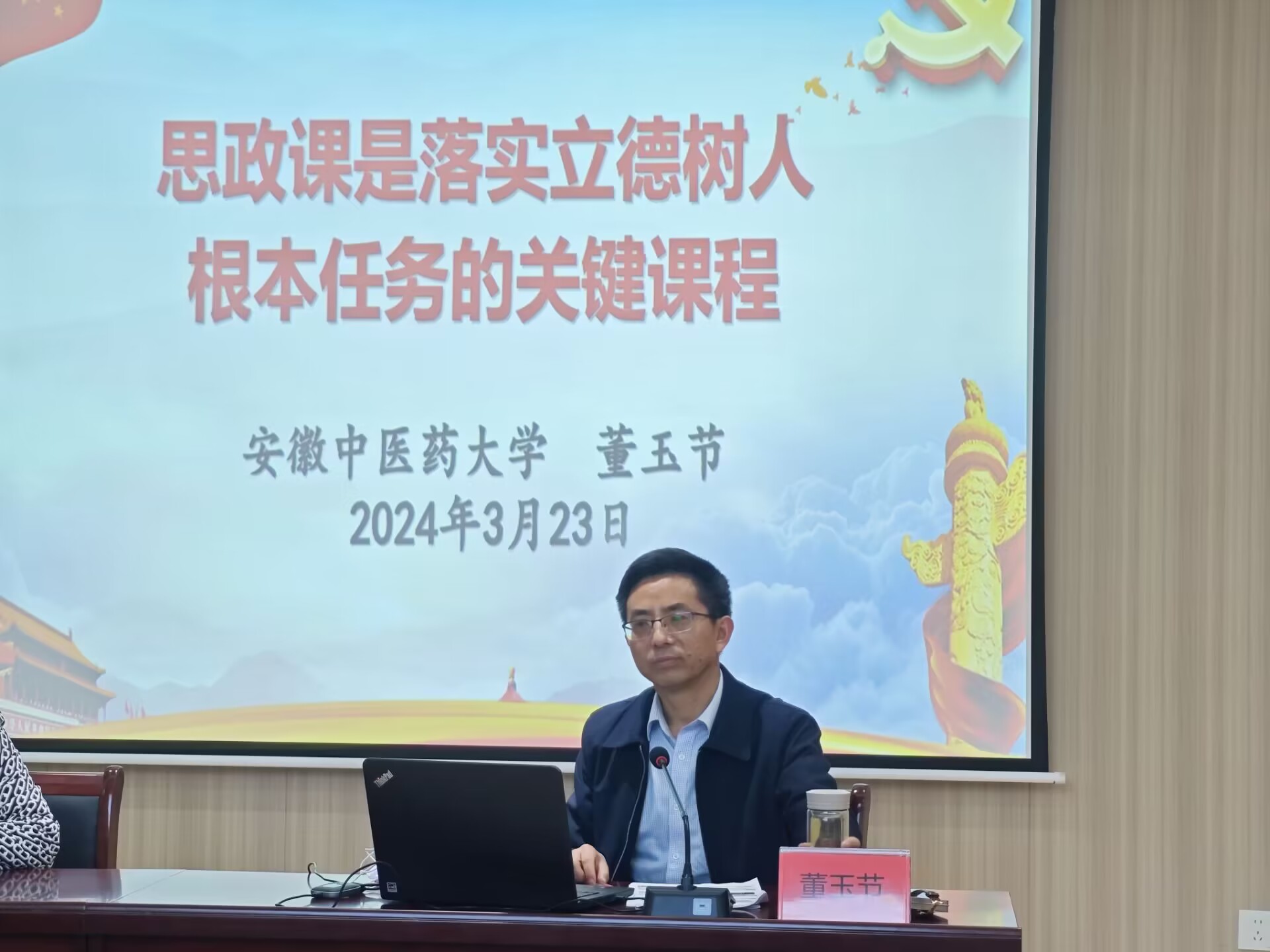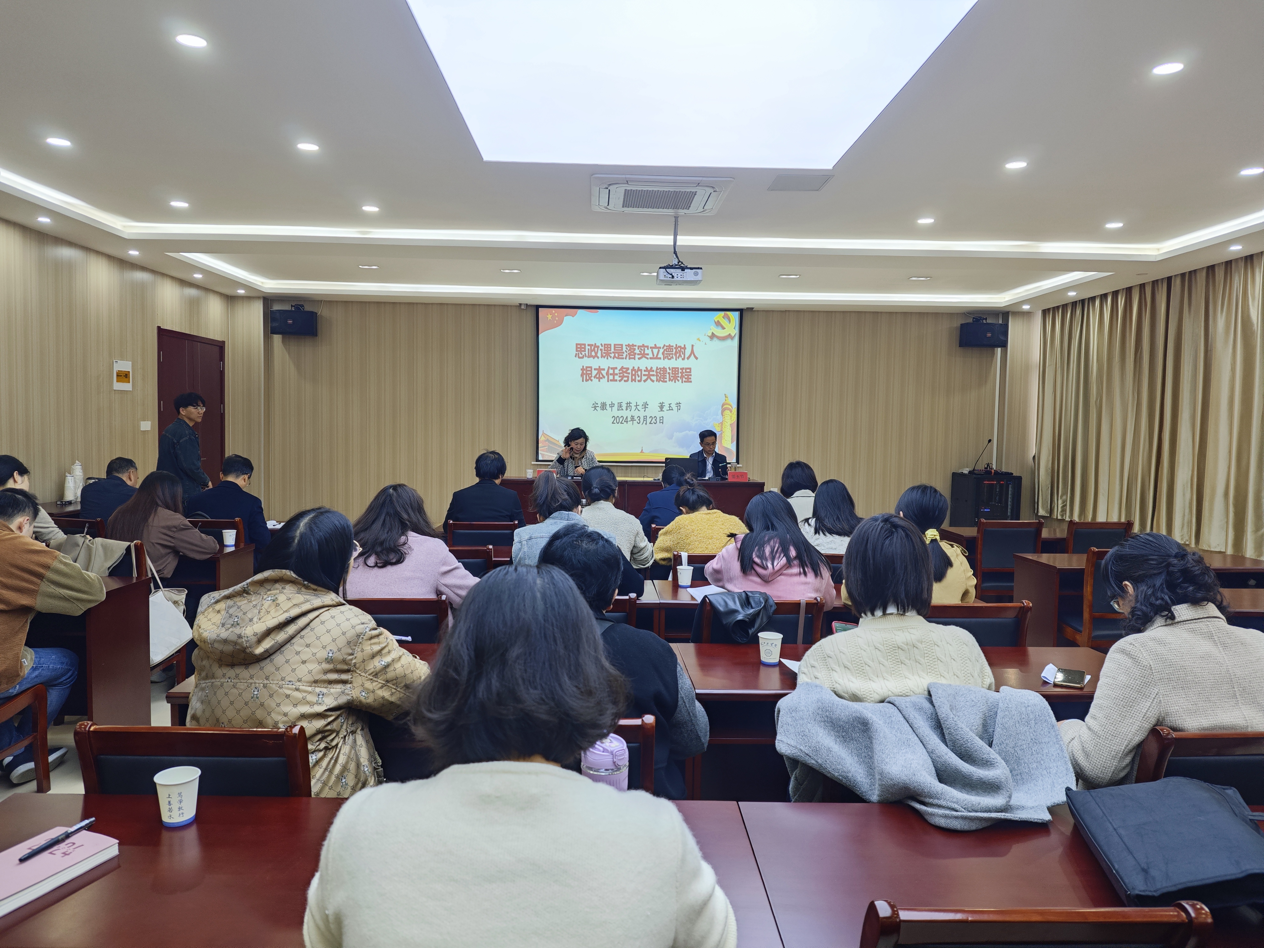 3月23日,安徽省高校思政课教指委委员、办公室主任、安徽中医药大学马克思主义学院院长董玉节教授,应邀莅临beat365马克思主义学院开展题为“思政课是落实立德树人根本任务的关键课程”专题讲座。beat365马克思主义学院党总支书记、常务副院长刘双,院长助理张春艳,各教研室主任及马院全体教师参加此次讲座。讲座由马克思主义学院党总支书记、常务副院长刘双主持。