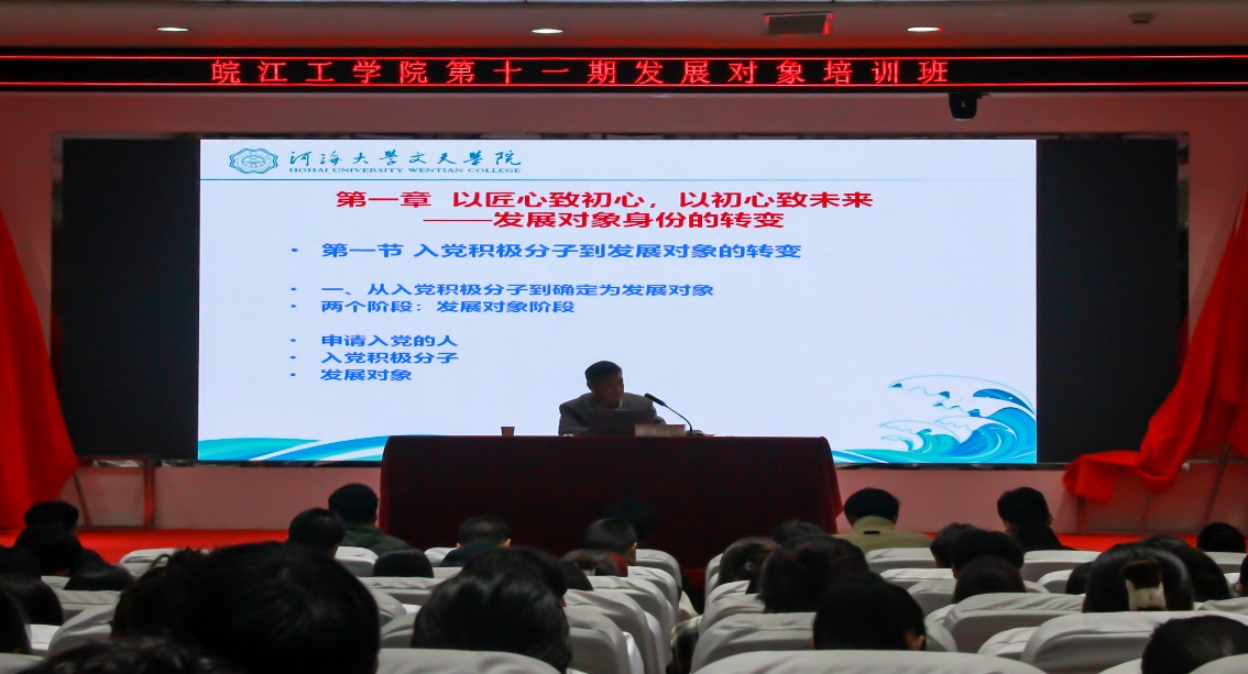 吴继敏围绕“发展对象的身份转变”这一主题,深刻讲解了“入党积极分子到发展对象的转变”和“预备党员的接受是发展对象质的飞跃”的改变,生动形象的讲解了怎样的转变以及转变后的应对措施。最后指出“以匠心致初心,以初心致未来”的主旨,要求各位发展对象要始终保持入党初心,为共产主义事业砥砺前行。