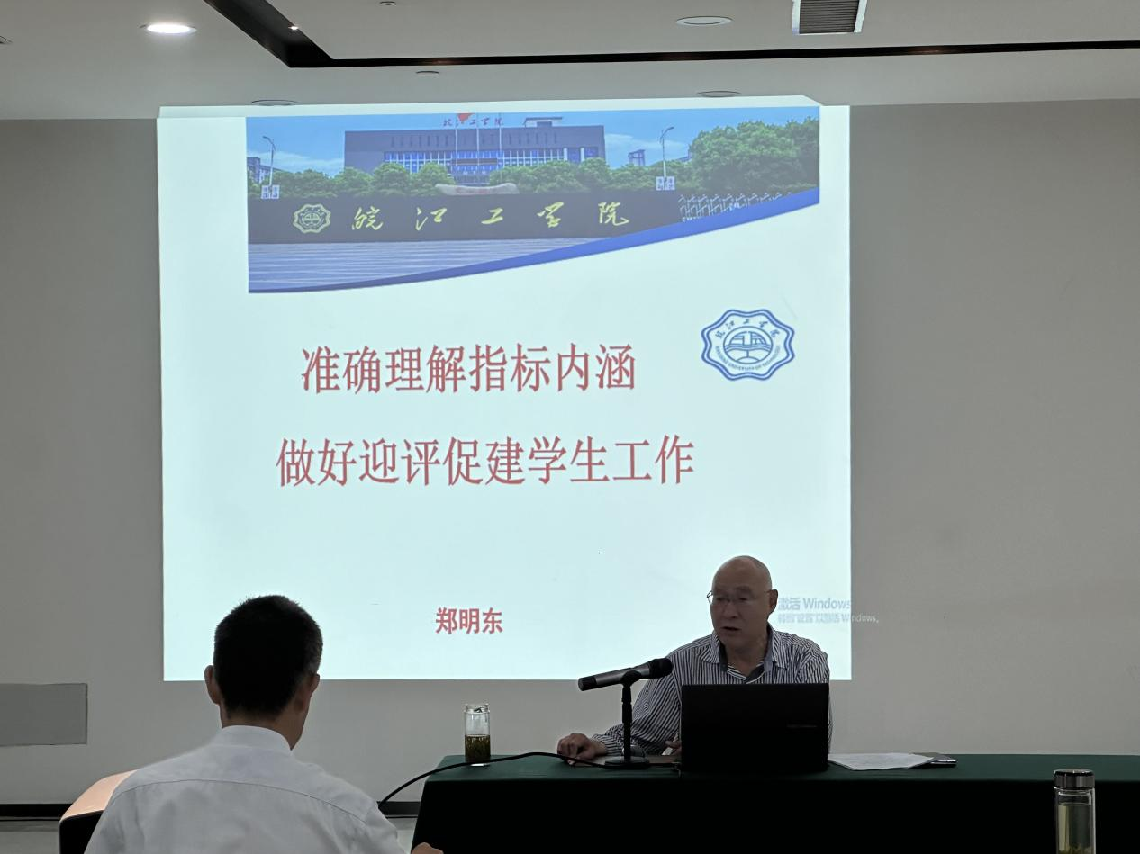 常务副校长郑明东以《准确理解指标内涵做好迎评促建学生工作》为题,围绕“认识再统一,做好学生参与评估的顶层设计”、“强化标准意识,构建和完善学生工作质量保障体系”“聚精会神抓落实,完善目标导向和成效导向新机制”“坚定信心,奋力作为,为建设区域(行业)高水平应用型大学而努力”等四个方面提出建议要求。