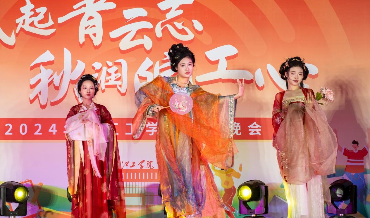 晚18:30时整,伴随着铿锵有力、气势磅礴的乐声响起,晚会在民乐、舞蹈《飞舞千年》中拉开帷幕。晚会分“遇见青春”、“梦想启航”两个篇章,涵盖歌曲、舞蹈、汉服走秀、合唱、乐器演奏等多元表演形式。全体演出人员共同表达赤诚爱国爱校情怀,他们以精湛的艺术演出,为新生树立了自立自强、实干笃行的典范,燃动了每一名在场观众的心。合唱《逆光》犹如一股春风,吹拂着每一位皖工学子的心田,激发起他们为实现梦想而奋斗的勇气。激情四溢的新生辅导员歌唱节目《new boy》传递出皖工师生与时代同频共振的担当精神。倾情演唱的歌曲《默》、《我好像在哪见过你》、《第一天》震撼全场,演绎出青年学子的意气轩昂,诠释出青春的别样定义。舞蹈《Klaxon》、《armageddon》引燃全场,展现新时代青年的生机与活力。歌曲《学不会》的每一个音符都化作同学们心中的光芒,照亮逐梦路上的点滴希望。汉服走秀表演《水龙吟》将古典元素与现代舞姿完美结合,心中有丘壑,眉目作山河,诠释了华夏少年对祖国的深切热爱。三人唱歌表演《阿嫲》带领观众感受红军坚韧不拔的意志、永不磨灭的功绩,讲述了先辈们赤胆忠心、无私奉献的故事,激励皖工学子磨砺出挺膺担当的品质。