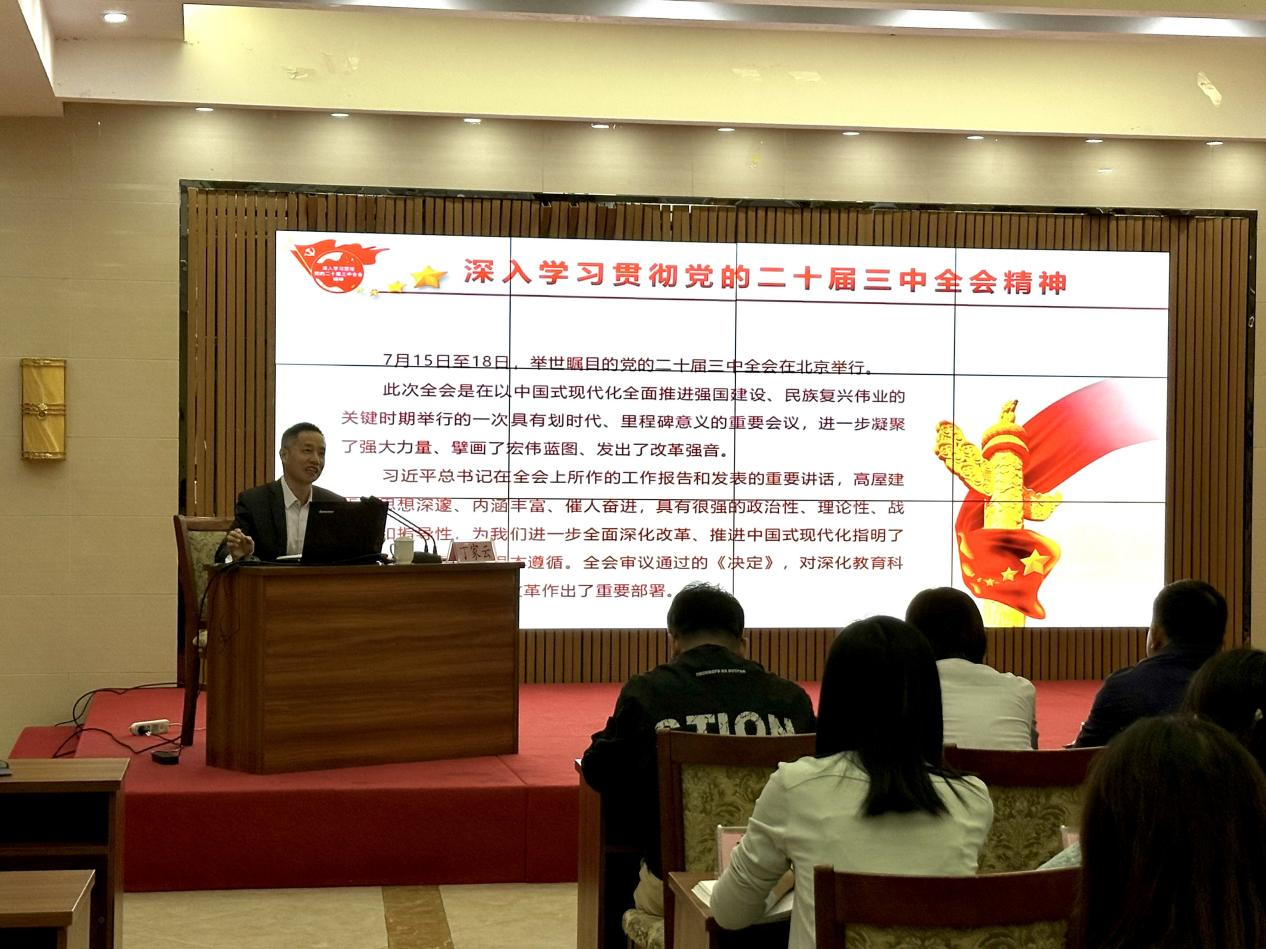 丁家云作学习党的二十届三中全会精神专题报告。他围绕“深刻认识重大意义,牢牢把握全会丰富内涵”“准确领会重大部署,把握教育改革发展方向”和“深入贯彻全会精神,落实立德树人根本任务”三个方面展开阐述。他要求,大家要把党的二十届三中全会精神学习领会好、贯彻落实好,用这一重要思想去联系指导我们的实际工作,不断提升教育教学水平,为推进学校本科教学合格评估工作、培养社会主义建设者和接班人、推进教育强国建设作出更大贡献。