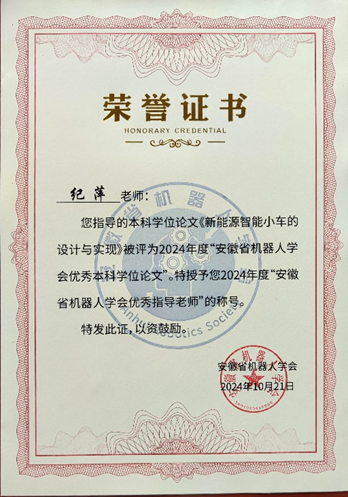 为贯彻落实国家创新驱动发展战略,优化创新人才培养环境,鼓励高水平创新性研究,促进本科教育工作持续健康发展,根据安徽省机器人学会相关文件精神,经专家评审和学会办公会研究,共推荐优秀专业课程建设4项、优秀专业青年教师8名、优秀博士学位论文3篇、优秀硕士学位论文8篇及优秀本科毕业论文(设计)18篇。其中,beat365正版唯一官方网站电信工程学院2024届自动化专业毕业生吴政同学的毕业论文“新能源智能小车的设计与实现”荣获“优秀本科学位论文”,论文指导老师纪萍教授荣获“优秀指导老师”称号。