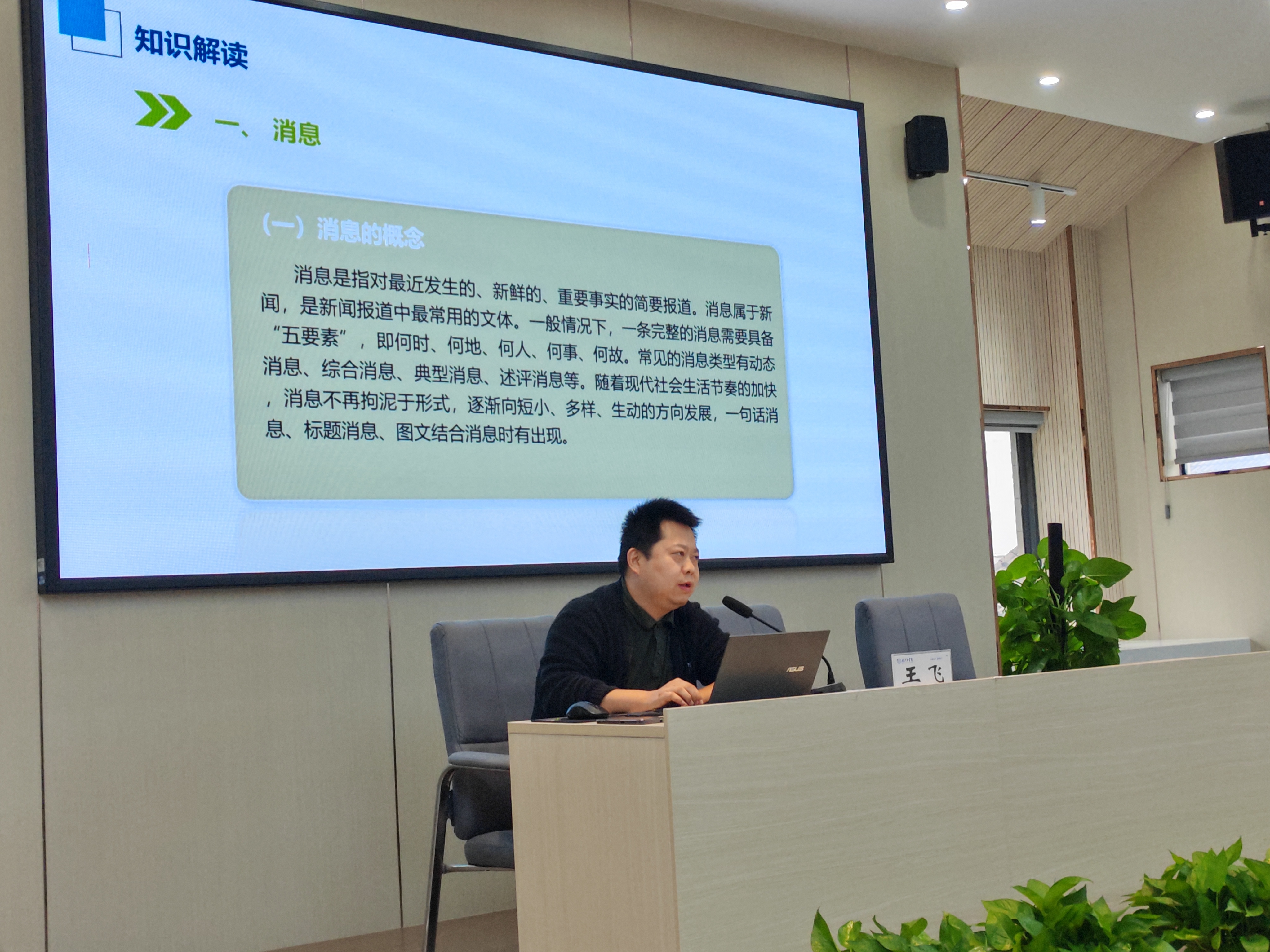 同时,针对学校宣传工作的特点,王飞还详细讲解了校园新闻的常见类型,如活动报道、人物专访、教学成果展示等,并分别给出了相应的写作建议,鼓励通讯员老师们多读、多写、多练,不断提高自己的写作水平。