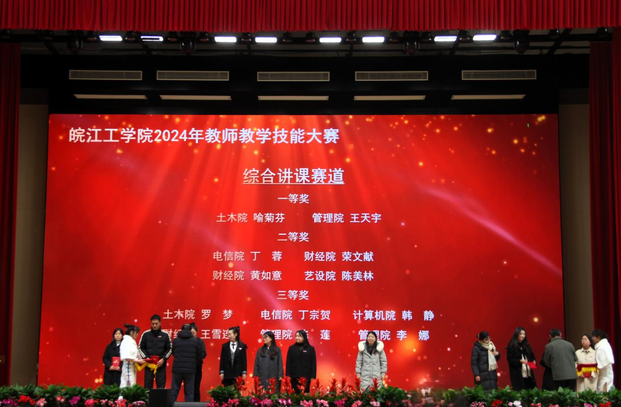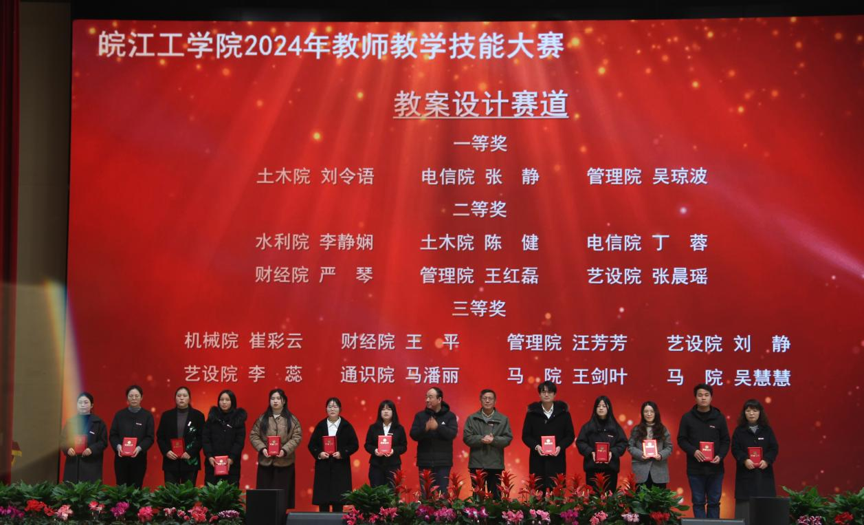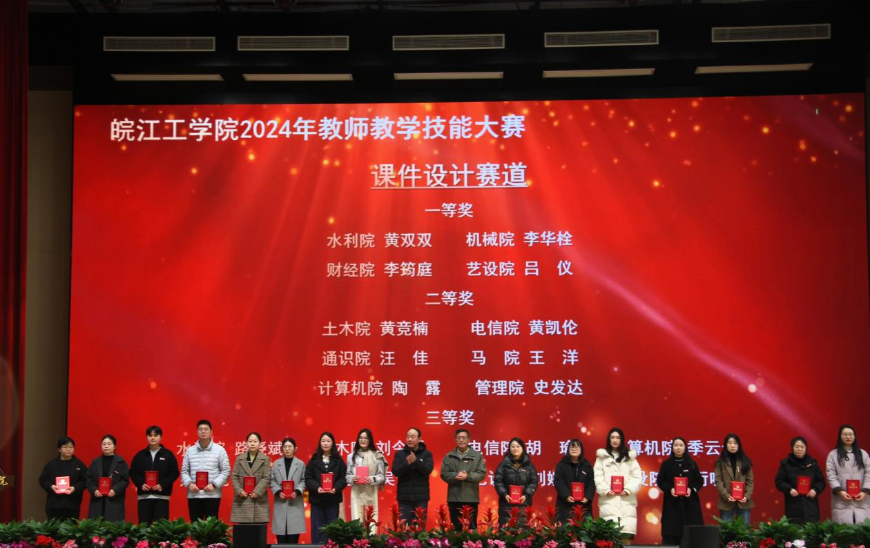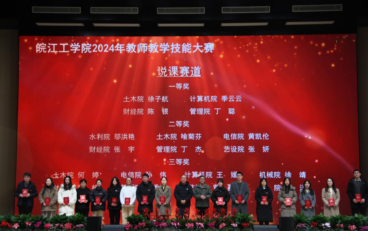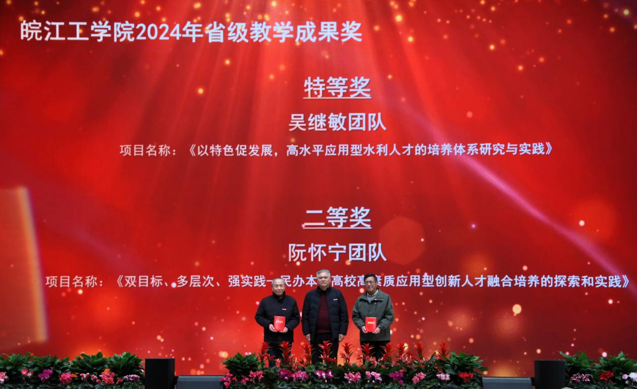 会上对学校2024年度各类教学竞赛获奖及教学成果获奖进行表彰和颁奖,校党委副书记孙良主持颁奖仪式。孙良宣读了学校表彰决定,董事长和校领导向2024年教学创新选拔赛、喜迎“新中国成立75周年”主题讲课比赛、教师教学技能大赛所有获奖人员(单位)以及2024年校级教学名师和教坛新秀、安徽省教学成果奖获得者颁发了荣誉证书。