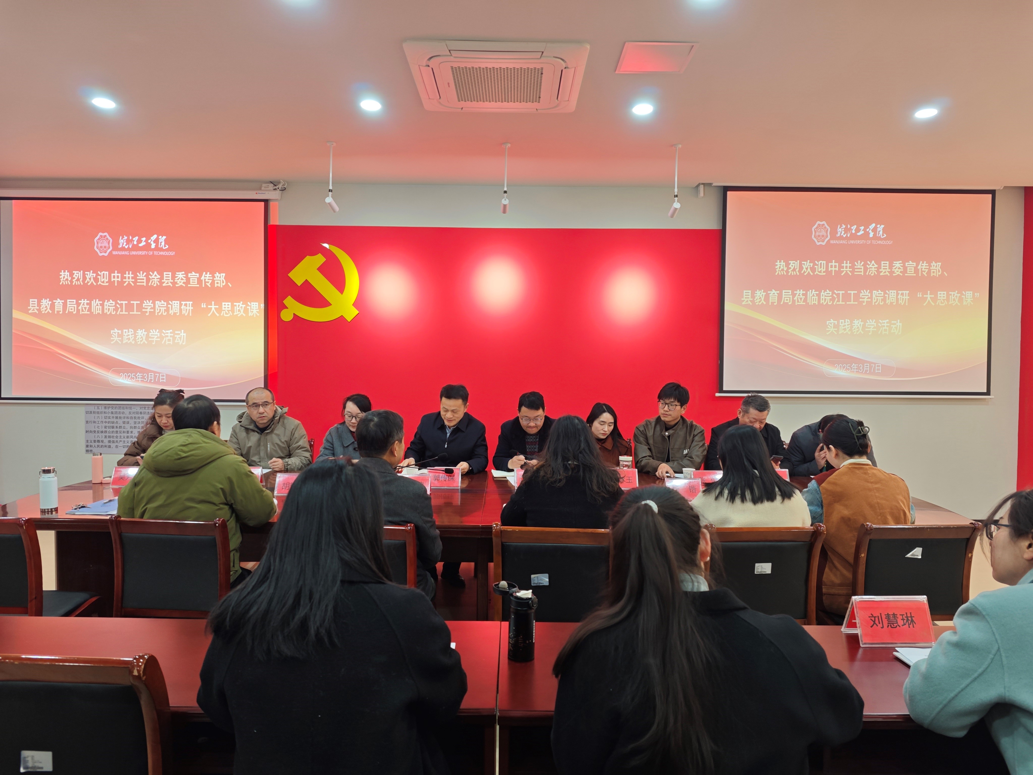 3月7日下午,中共当涂县委宣传部、当涂县教育局、当涂县大中小学校、当涂县千字文书院等单位来beat365马克思主义学院调研“大思政课”实践教学活动。调研会议在笃学楼西马克思主义学院405会议室举行。中共当涂县委常委、宣传部部长郭传保,宣传部副部长王平,县委宣传部理论室(意识形态室)负责人王沅霞,县教育局总督学宁冰玉,德育办(青少年活动中心)副主任谷俊,马鞍山学院马克思主义学院思政教师张俊,当涂县实验学校校长吴芳龄,当涂一中党委委员、党务办主任兼县中学政治教研员邰纯兵,千字文书院院长冯金城等参加调研。beat365党委副书记孙良,马克思主义学院党总支书记、常务副院长刘双,副院长胡耀东,各教研室主任和马鞍山市“大思政课”实践教学研究中心秘书组全体人员出席会议,会议由孙良主持。