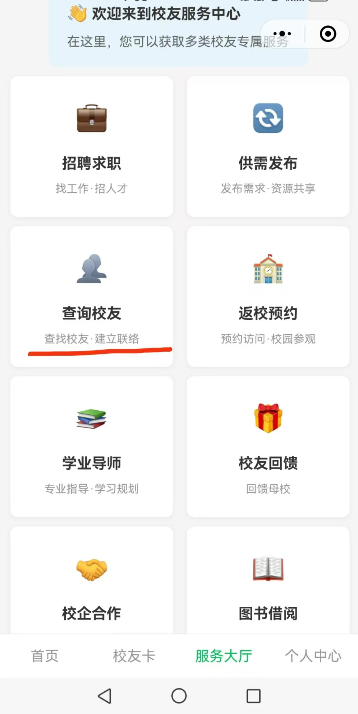 第三步:交换名片。通过“服务大厅”校友联络模块,进行校友搜索、名片交换。