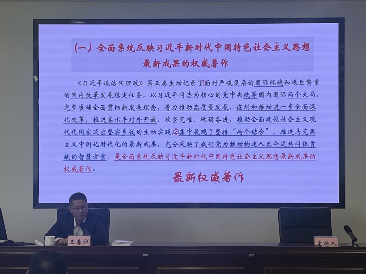 市委党校马克思主义基本理论教研室主任、副教授王春祥作《习近平谈治国理政》第五卷导读专题辅导。王春祥教授阐释了《习近平谈治国理政》第五卷意义重大,是习近平新时代中国特色社会主义思想最新成果的权威著作,也是实现党的二十大宏伟蓝图的行动指南。在核心要义方面,王春祥以“四个之问”串联,强调结合党的二十大报告把握中国式现代化等关键内容。在实践要求上,他提出从思想、政治、行动“三个自觉”入手,学原文、强认同、转化成果,并结合马鞍山发展实际,强调用理论推动工作。