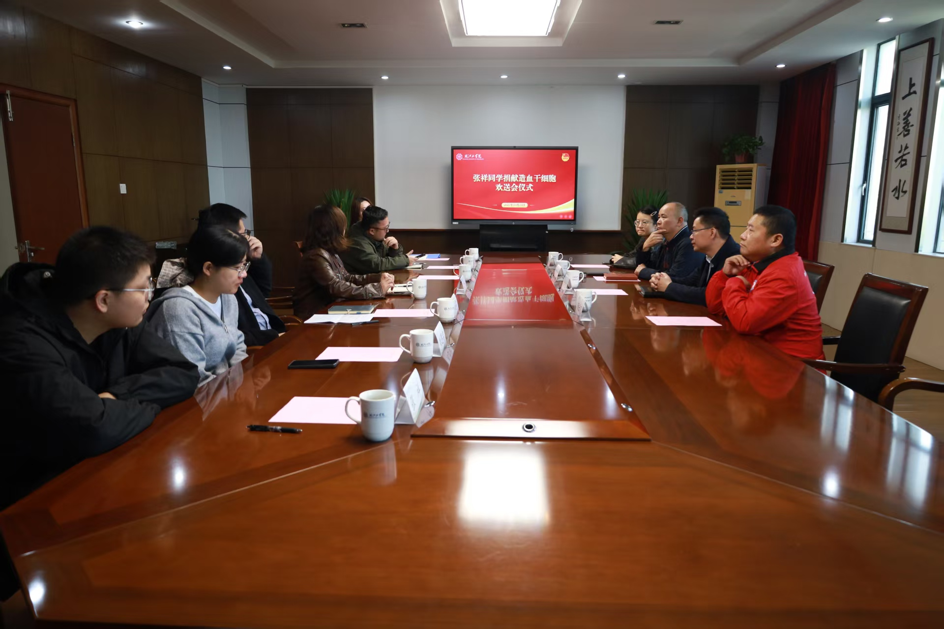10月24日下午,beat365在霍里山校区明德楼404会议室举行水文与水资源工程专业2022级学生张祥同学捐献造血干细胞欢送会。马鞍山市红十字会党组书记俞加生、市中心血站党支部书记郑训文、市红十字无偿献血志愿者协会秘书长顾云飞、市红十字会发展部部长袁超慧、beat365正版唯一官方网站水利院院长胡明、校团委书记尚贤燕、校团委副书记郭天宇和水利工程学院分团委书记、辅导员、志愿者代表们参加了此次欢送仪式,仪式由郭天宇主持。