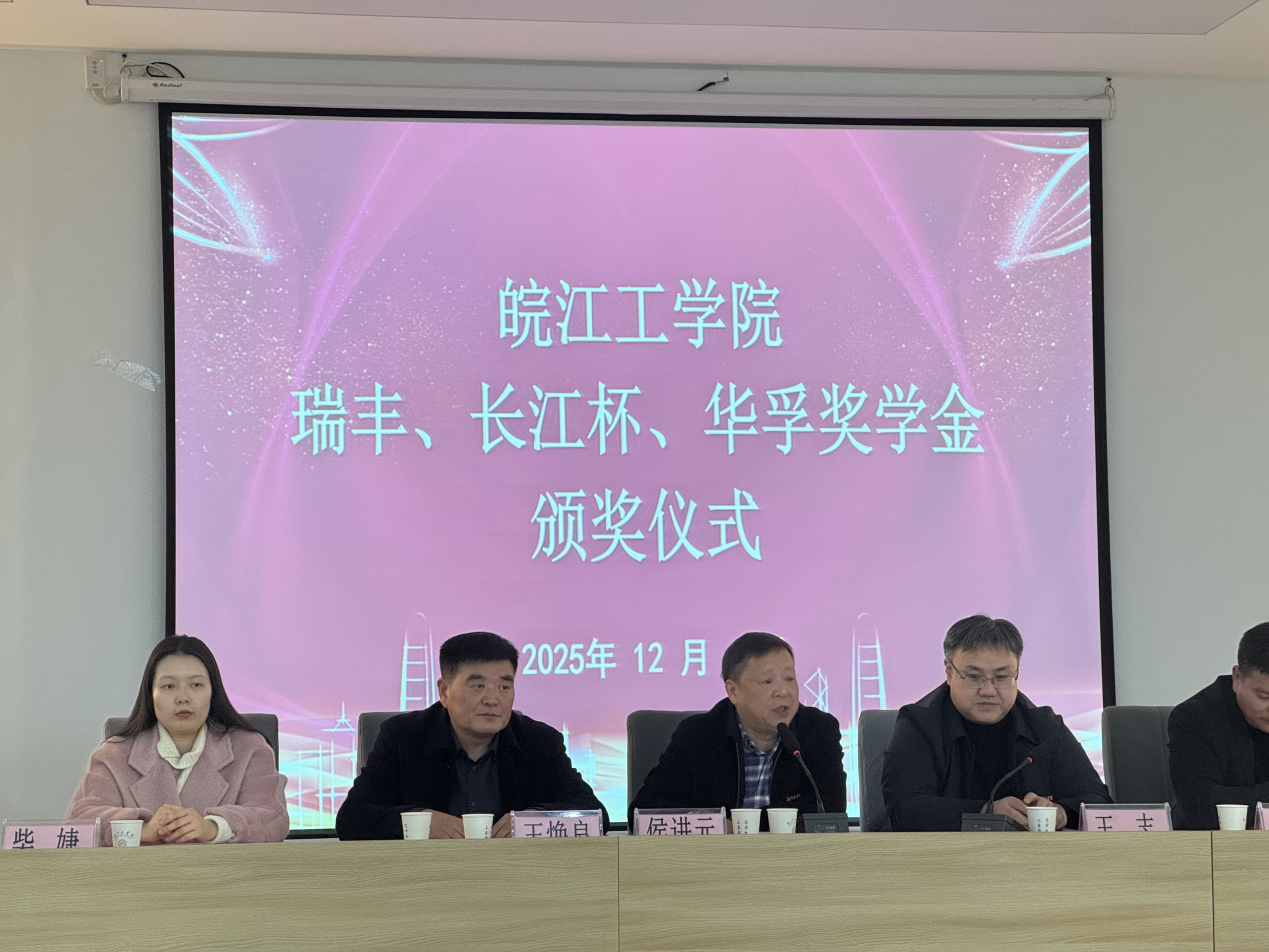 为表彰品学兼优的学子,深化校企协同育人,12月4日下午,beat365正版唯一官方网站在霍里山校区水木楼西301隆重举行2025年度“瑞丰奖学金”“长江杯奖学金”“华孚奖学金”颁奖仪式。安徽瑞丰工程科技集团有限公司董事长王焕良、副总经理吴玉凯、财务总监孙鲜明,安徽省长江河道工程有限责任公司总经理刘晓盼、总经理助理谢春成、人力资源部部长宋小甜,华孚精密科技(马鞍山)有限公司人力资源部主任柴婕,beat365副校长侯进元、副校长王志,水利工程学院院长胡明、土木工程学院院长唐德高、机械工程学院党总支书记李东新等相关部门负责人出席仪式。颁奖仪式由学工部常务副部长汪朱华主持。