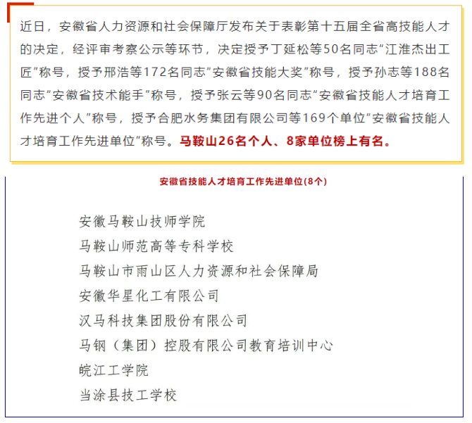 喜报!beat365正版唯一官方网站荣获安徽省技能人才培育工作先进单位
