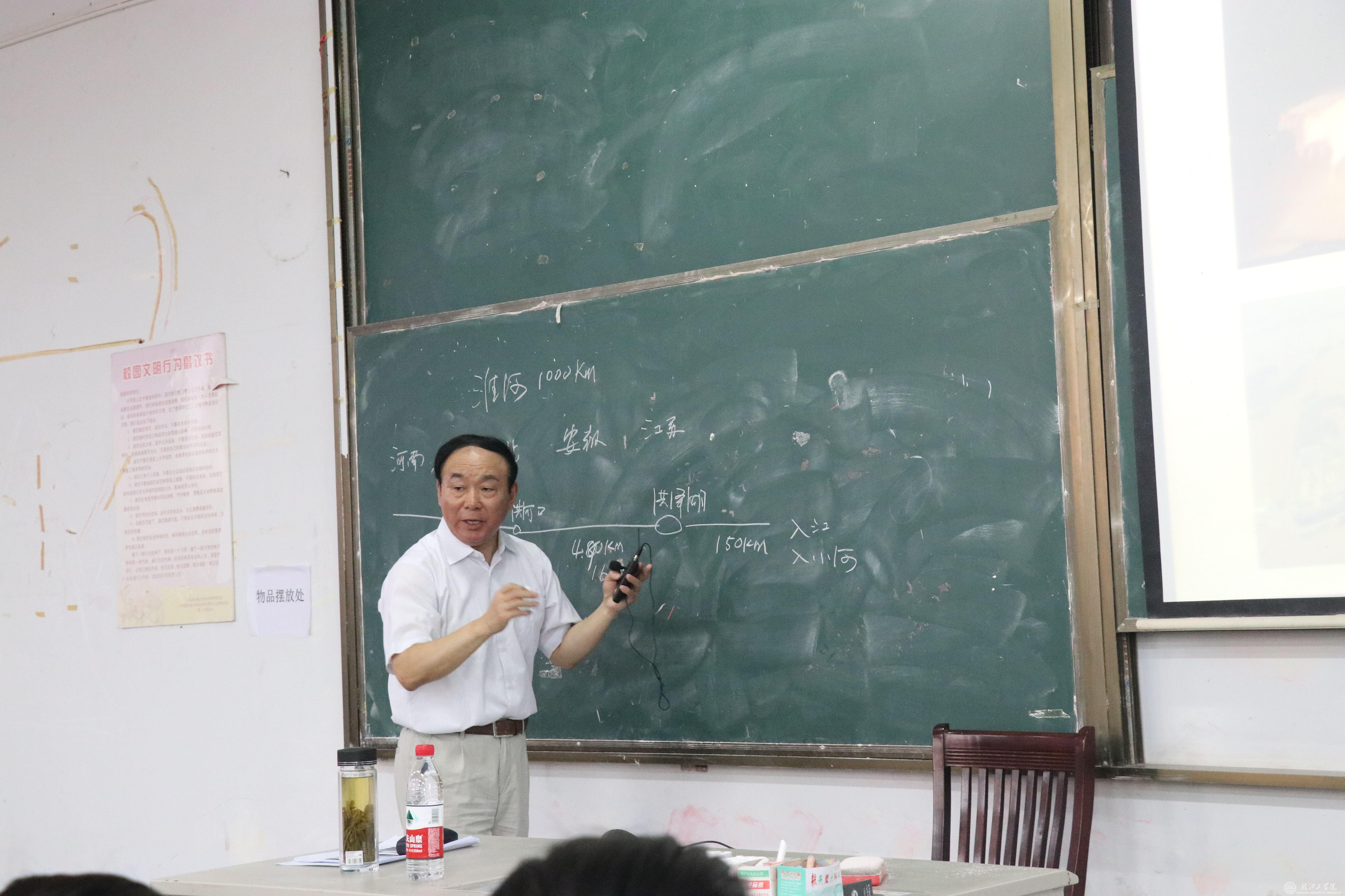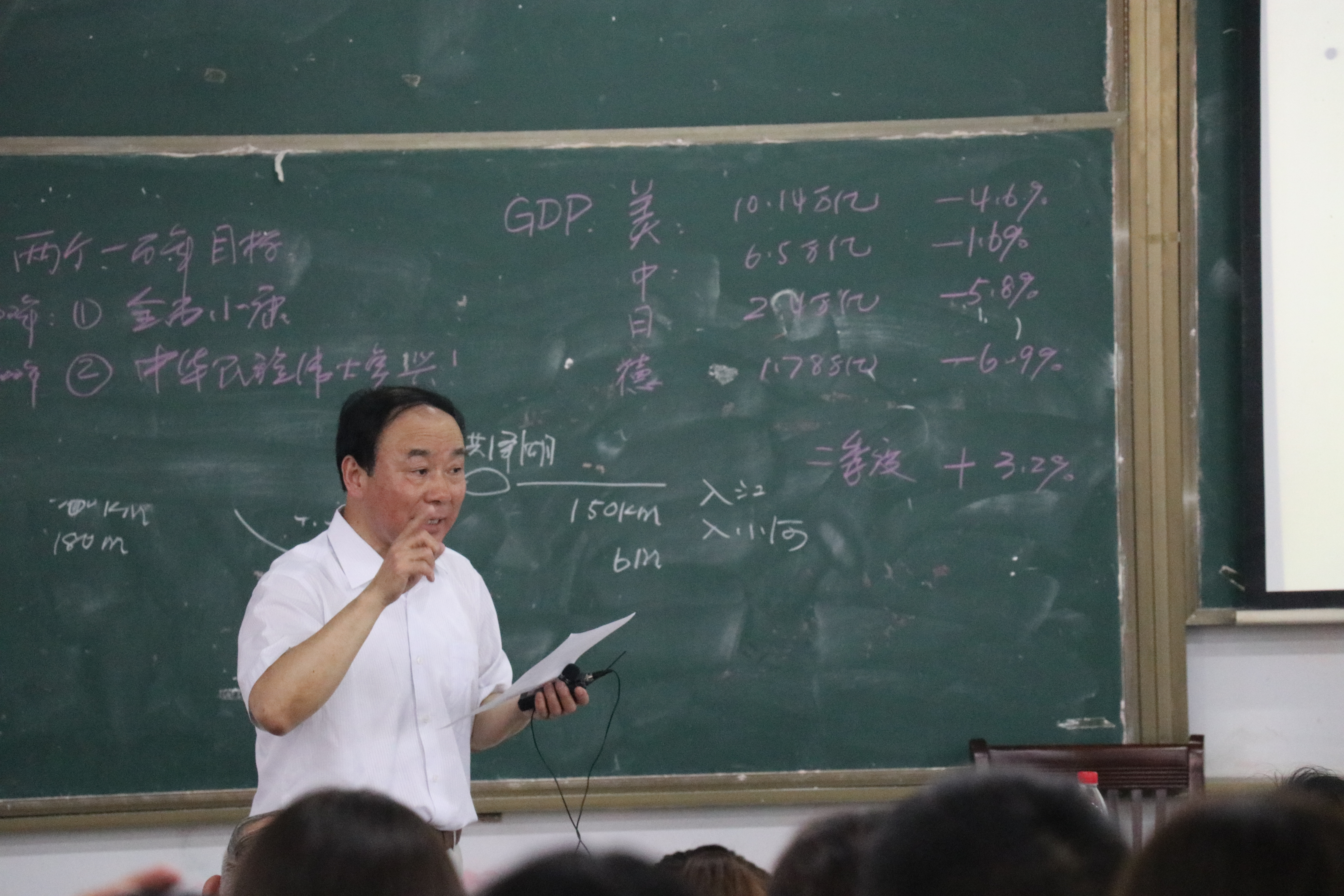 在讲座的第一部分,刘志祥不仅详细讲述了习近平总书记安徽考察的每个点,而且还做了大量板书。为了深度讲解习近平总书记考察王家坝的意义,他还在黑板上画了淮河流域的水域地图,用数据和图线让听课师生认识王家坝在防汛中的意义,感受王家坝精神;他把习近平总书记考察薛家洼及薛家洼整治效果对长江的生态改善的意义讲的温暖生动,让听课的全体师生深切感受到总书记“人民至上”的治国理念,更感动于习近平总书记对安徽的深切关怀。在我国当前经济形势部分,刘志祥书写了2面板书,整理了大量数据、图表,令人震撼的数据,使全体听课师生切身体会到了祖国的强大离不开党的领导!